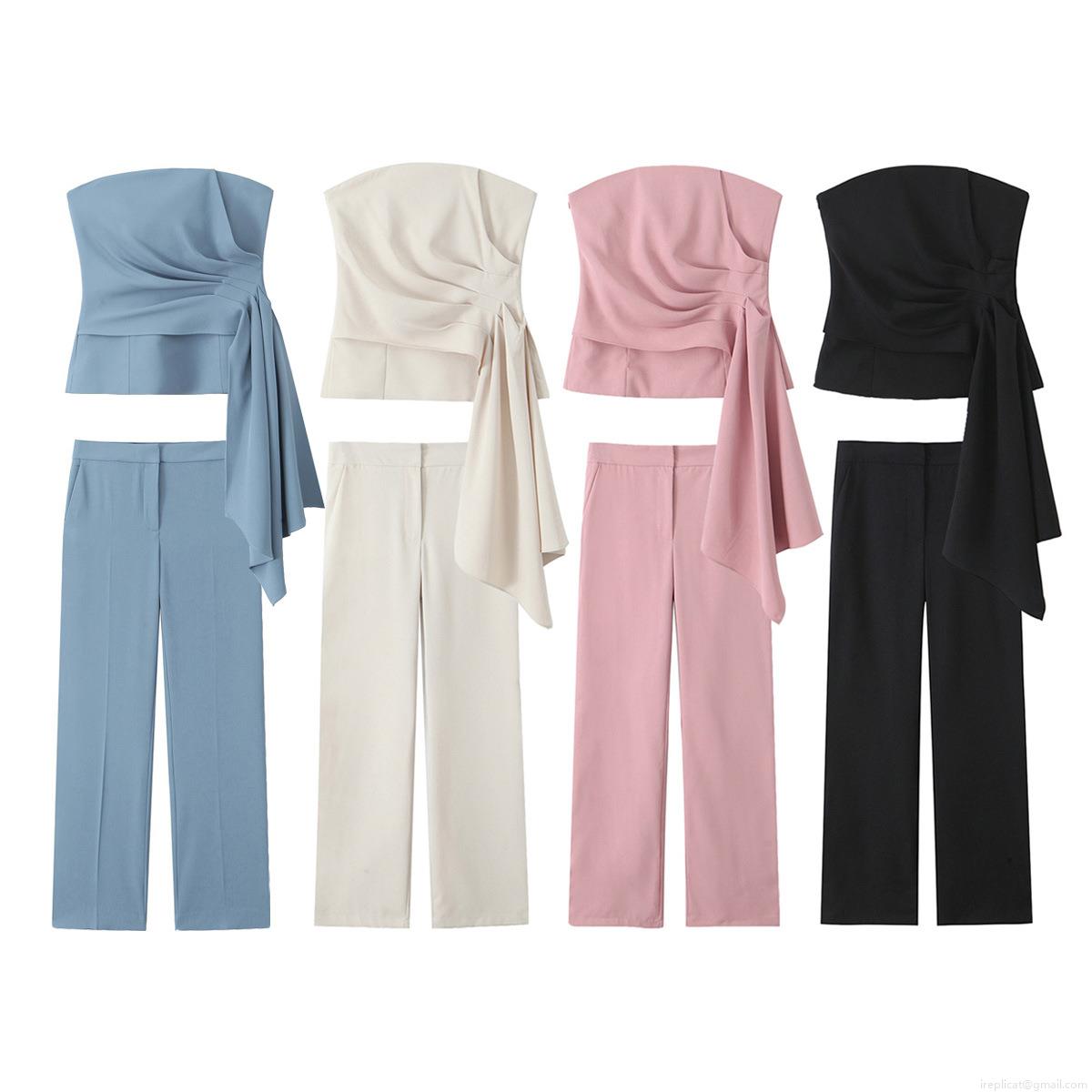 • Women's Two Piece Set Strapless Asymmetrical Pleated Corset Top And High Waist Straight Leg Trousers Polyester Summer Party Streetwear Outfit