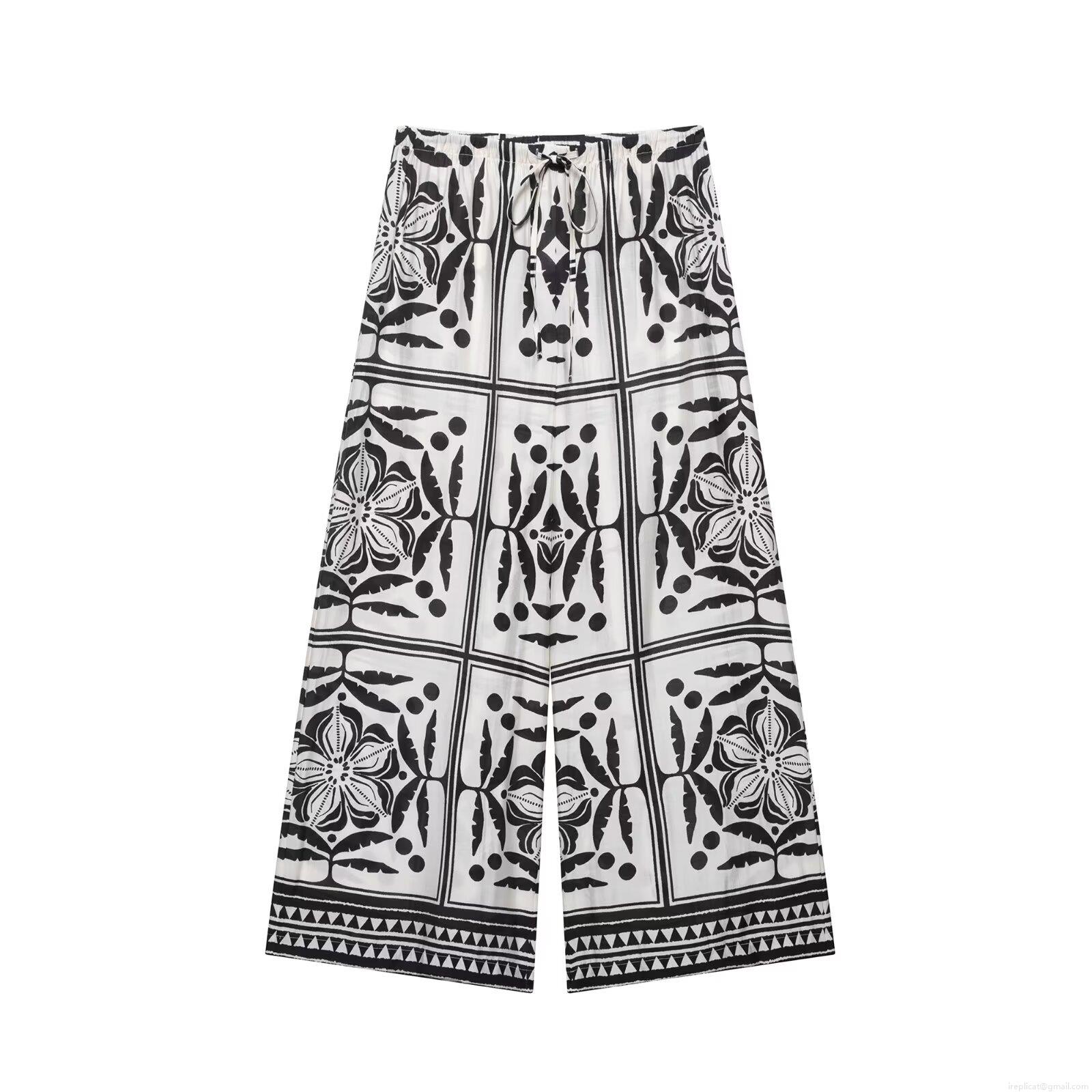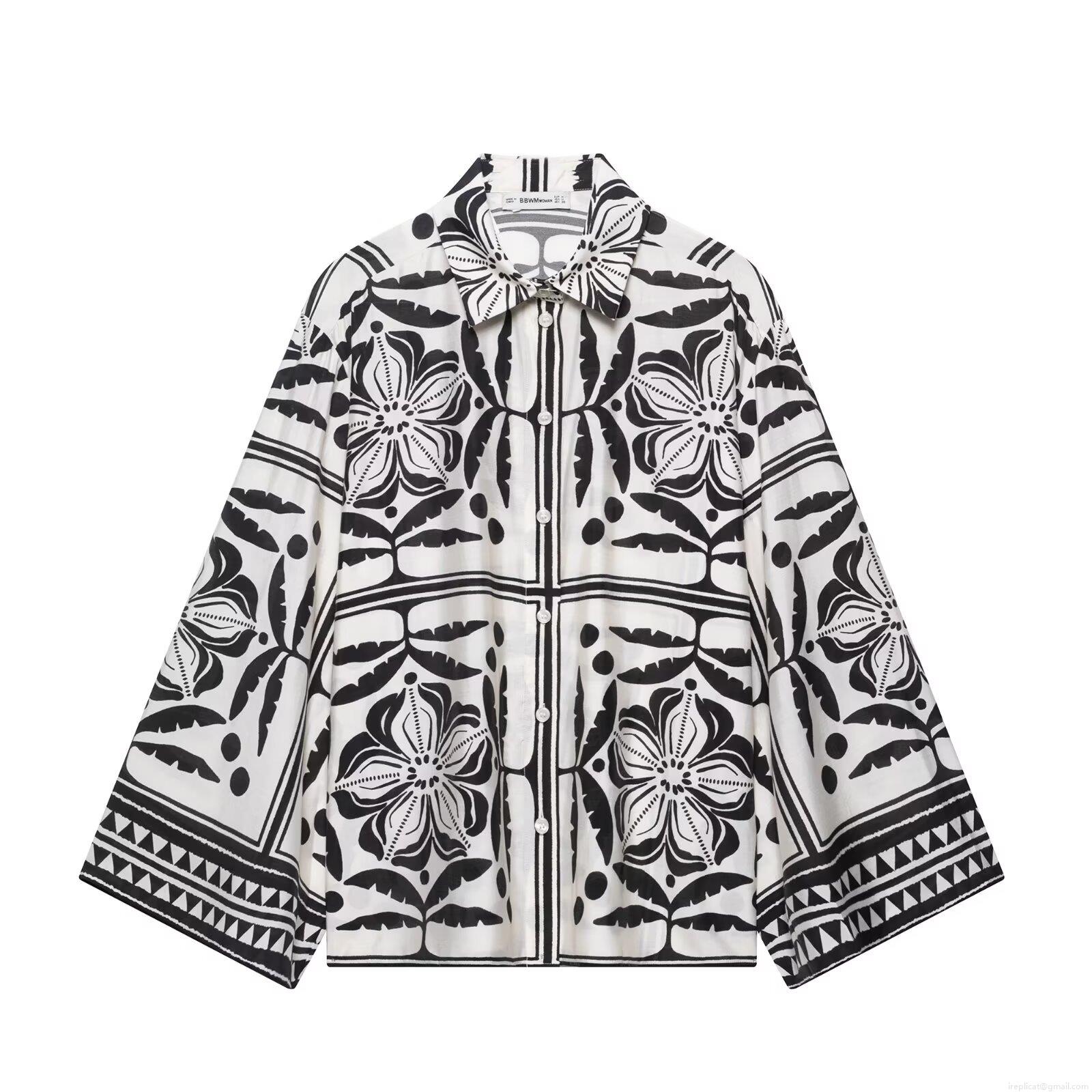 • Women's Two Piece Set Tropical Floral Geometric Print Color Block Long Sleeve Button Down Shirt And High Waisted Wide Leg Pants Vacation Outfits