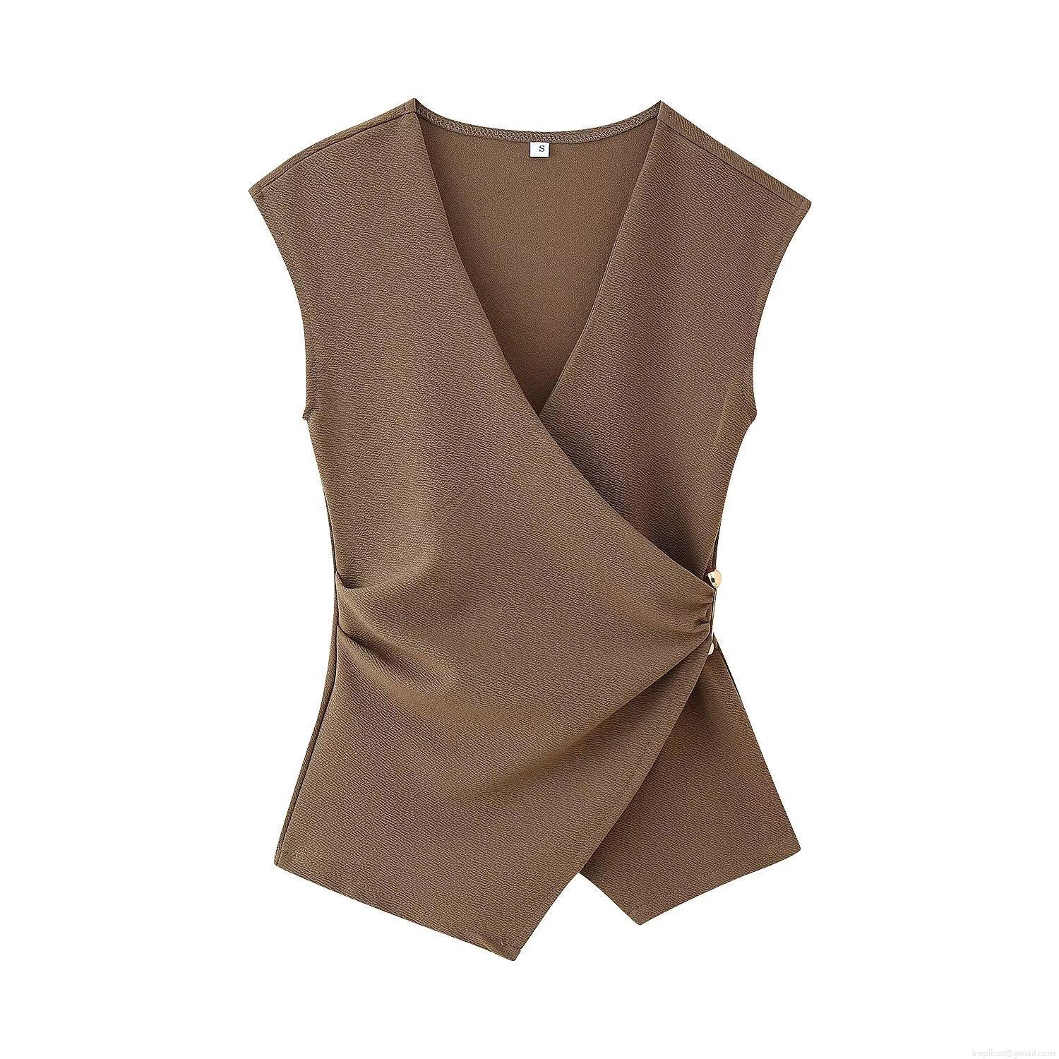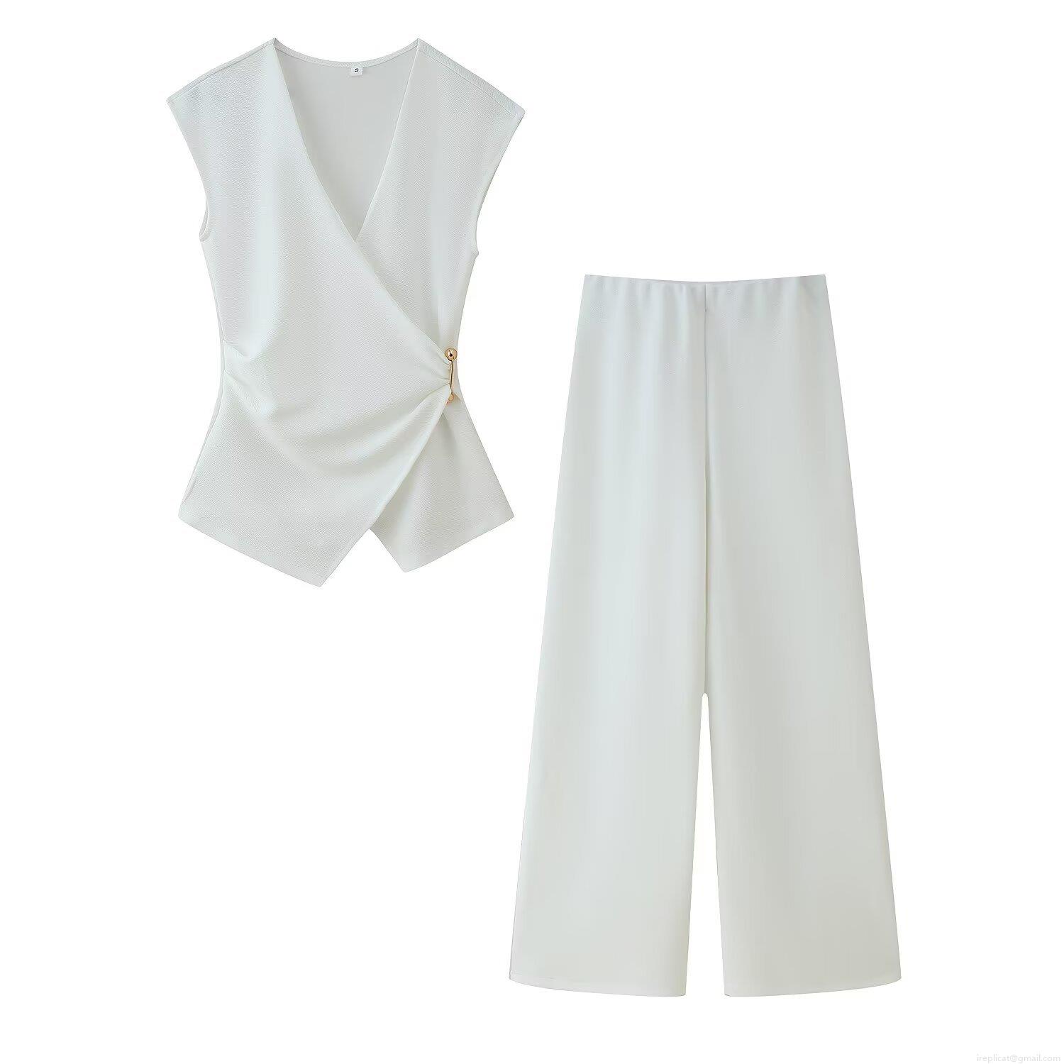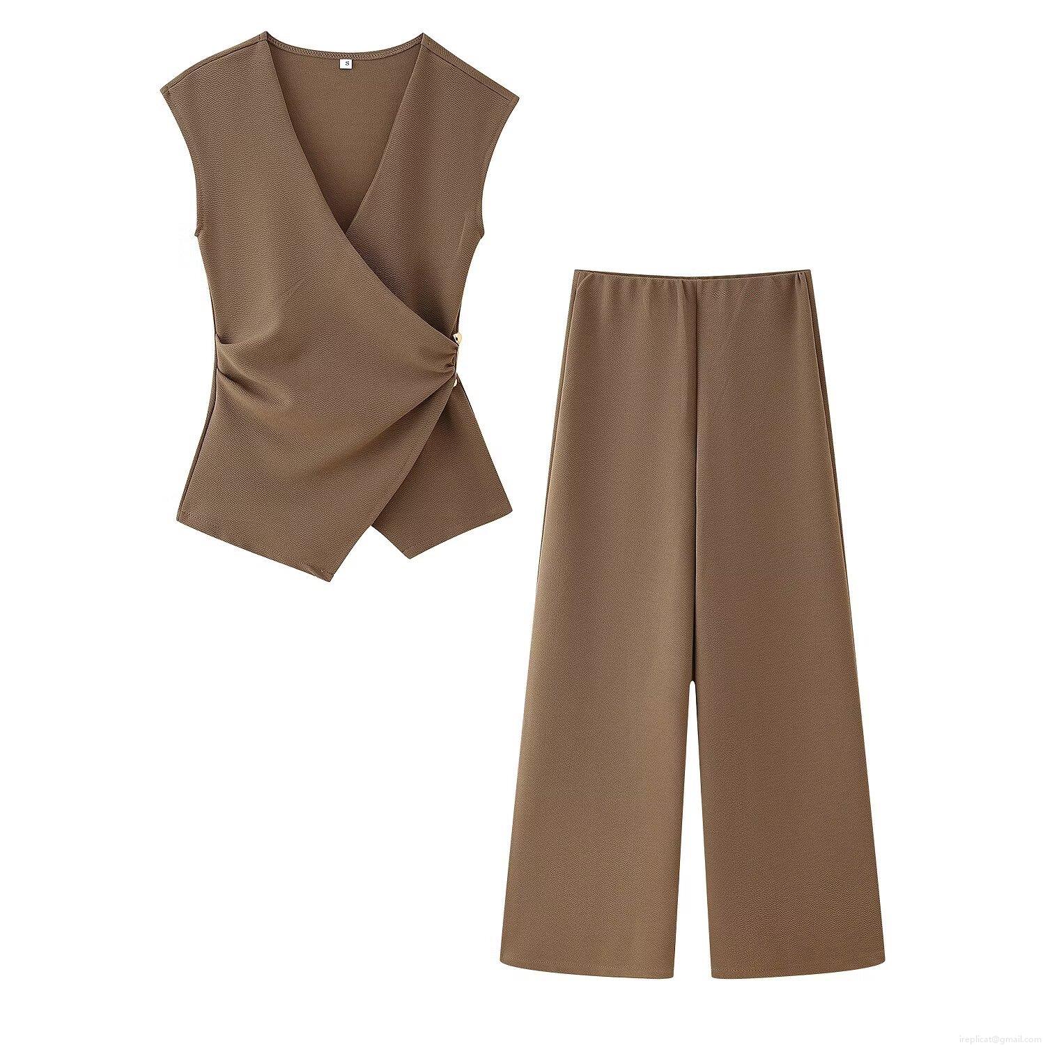 Women's Two Piece Set Wrapped V-Neck Sleeveless Vest Top High Waist Wide Leg Pants Outfits with Metal Pin Detail Streetwear Polyester Minimalist Suit