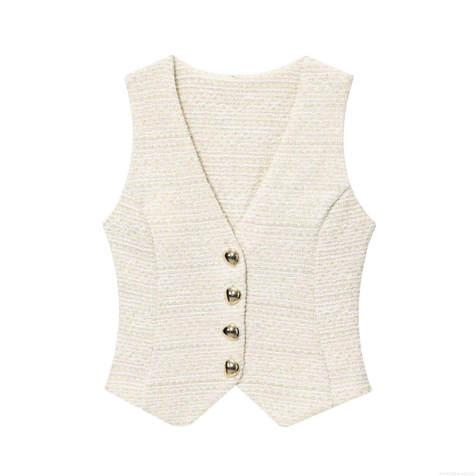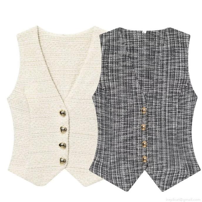 • Women's Two Piece Tweed Outfit Sleeveless V Neck Vest With Gold Buttons And High Waist Wide Leg Pants Elegant Casual Office Sets Streetwear