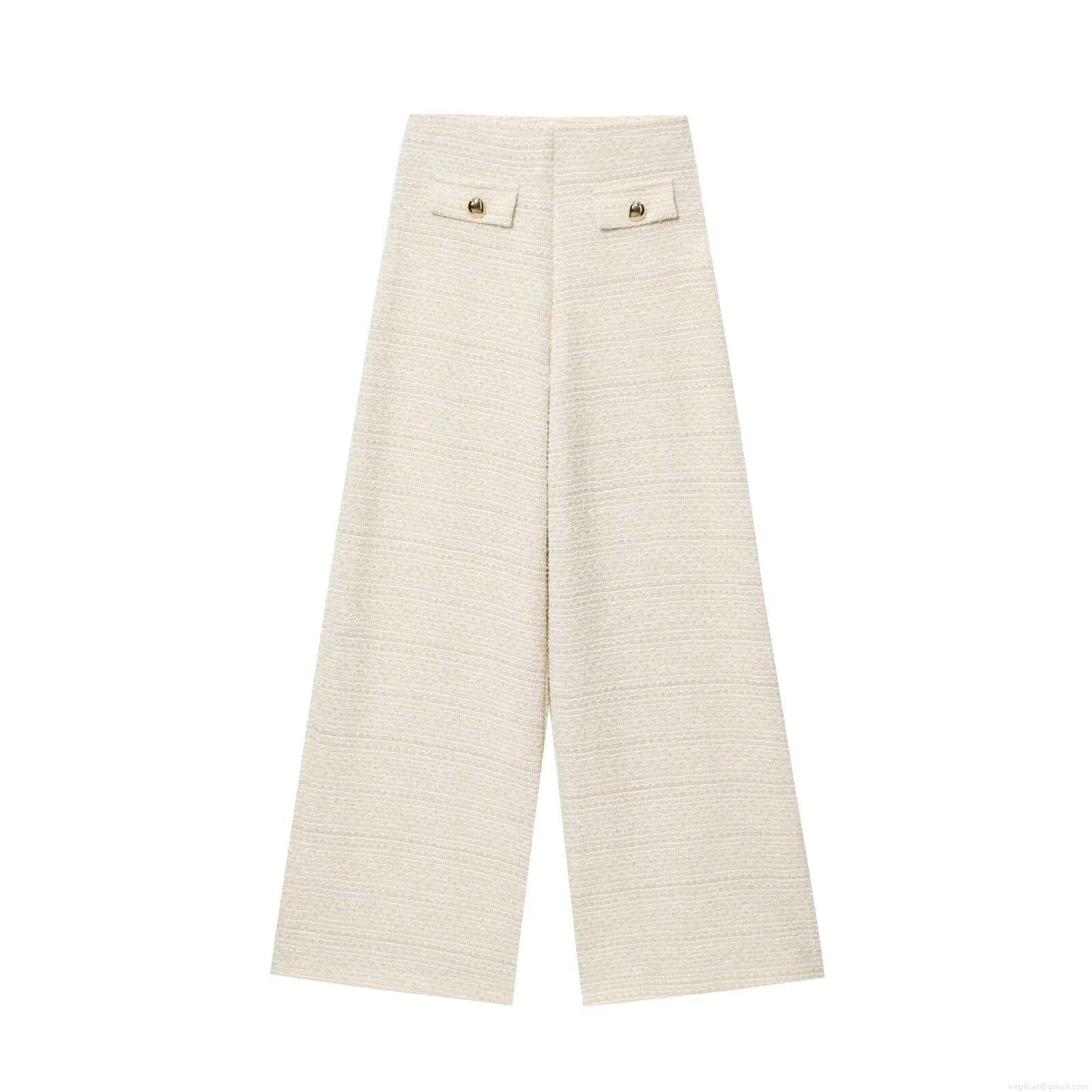 Solid Color, Metal Buckle, Woven Texture, Tweed Texture, Gold Buttons, Wide-leg Style