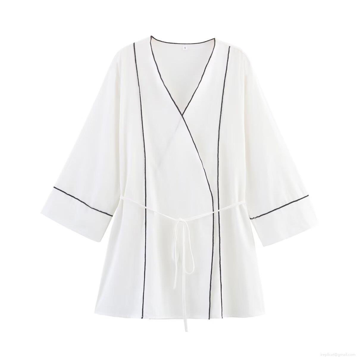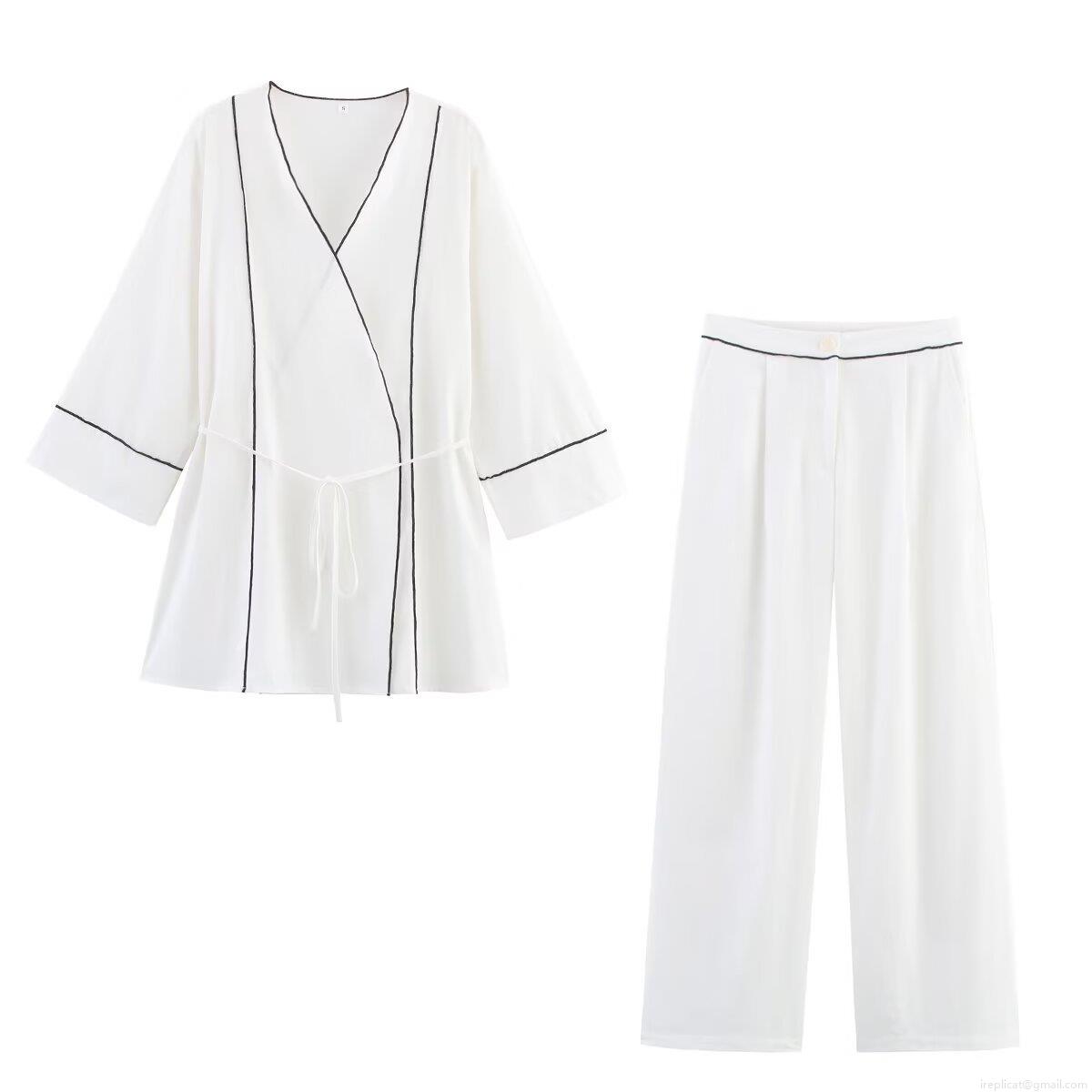 Women's Two-Piece Set Contrast Piping Wrap Tie Long Sleeve Jacket And Wide Leg Pants Casual Minimalist Lounge Vacation Outfit For Lady