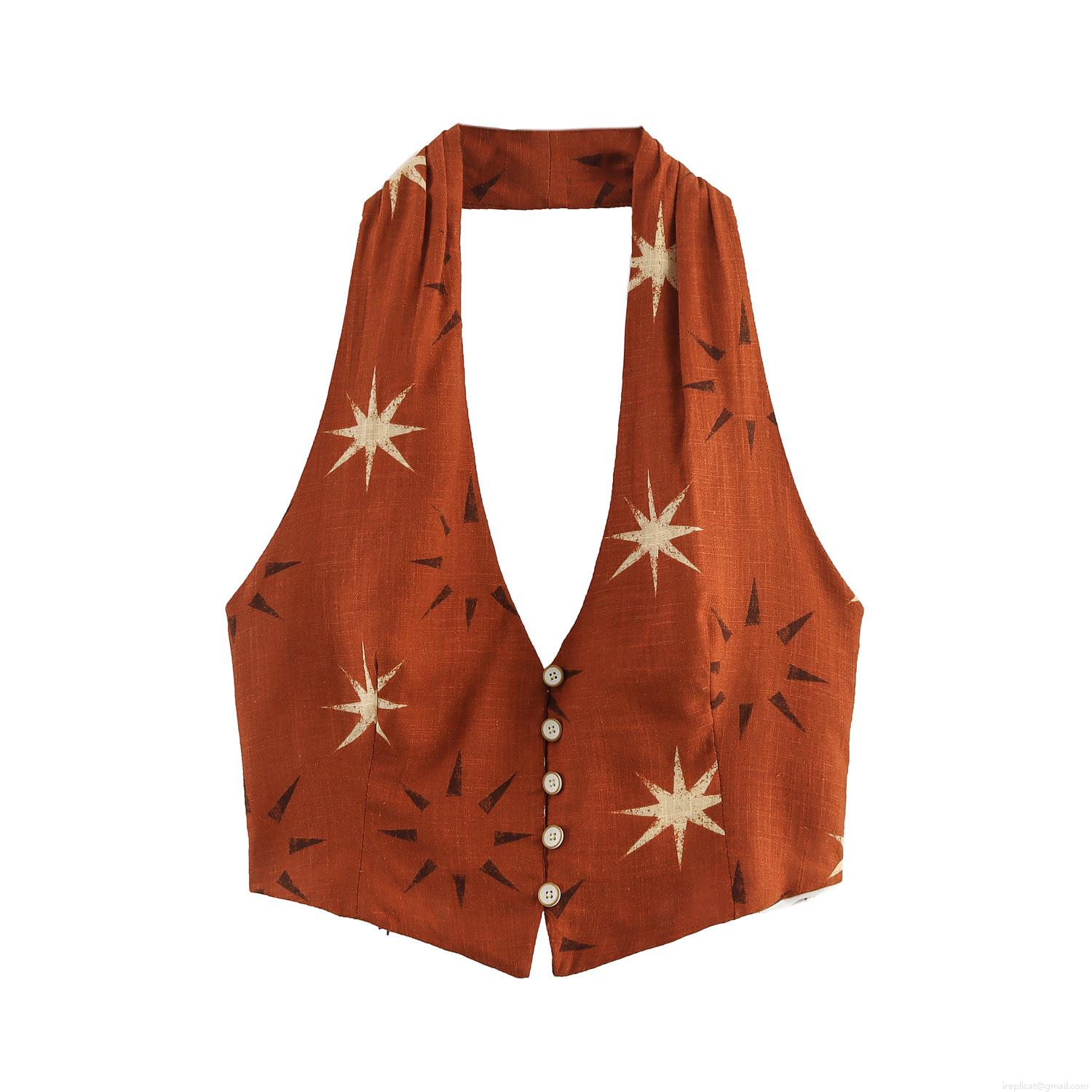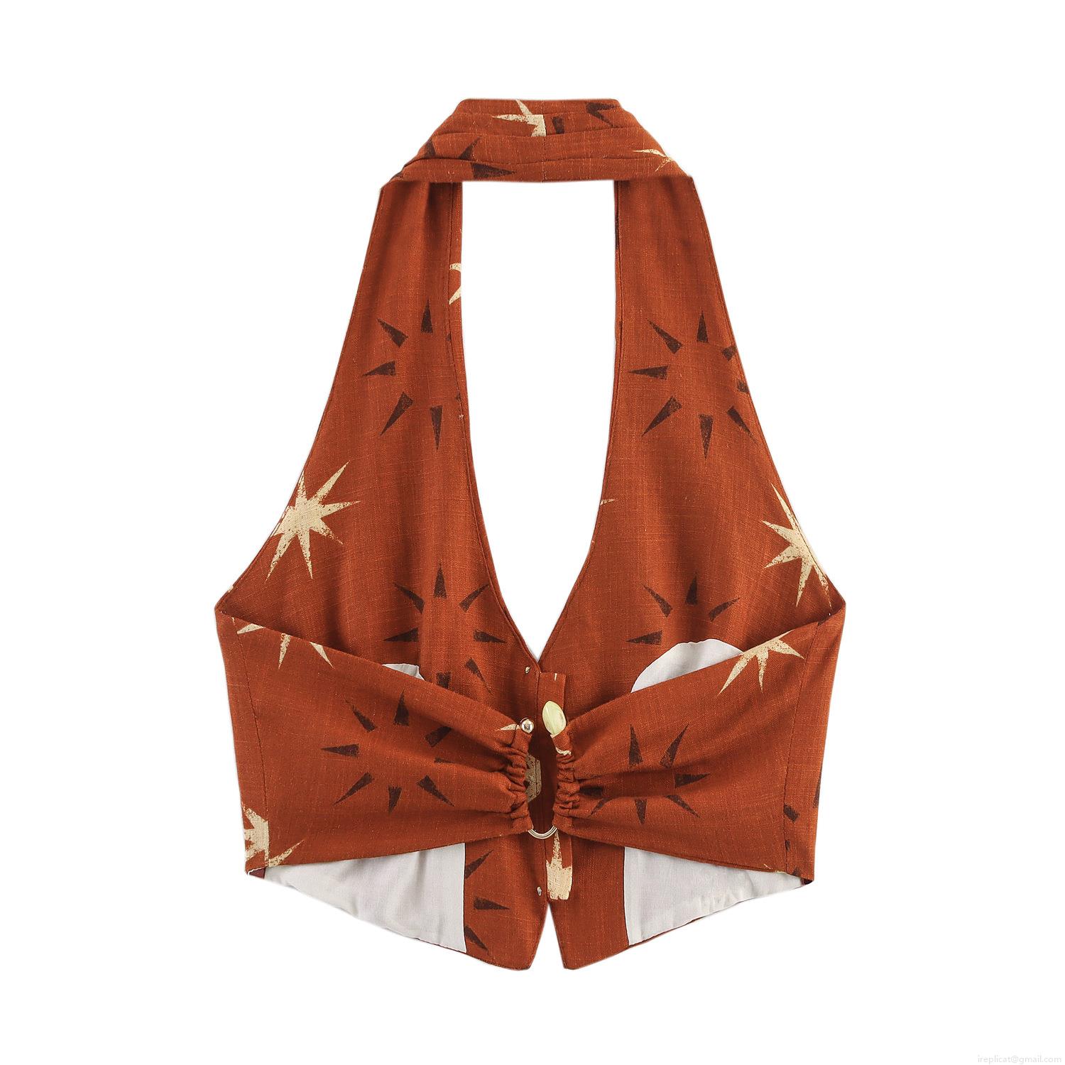 • Women's Two-Piece Set Linen Blend Polyester Halter Neck Cropped Top and High Waist Wide Leg Pants Vintage Sun Star Print Bohemian Style Summer Beach Vacation Holiday Wear For Women