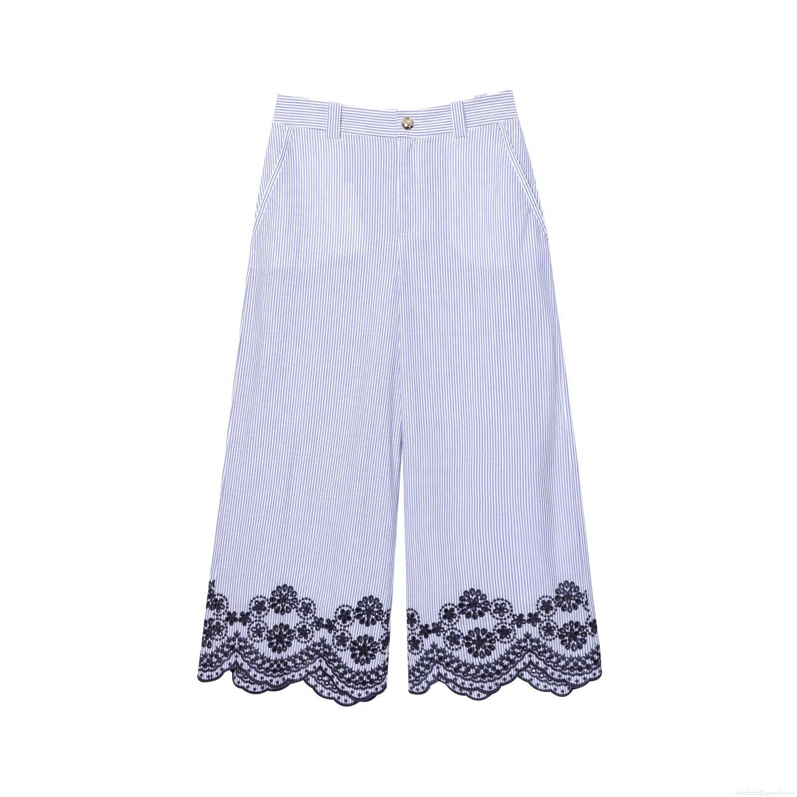 • Women's Two-Piece Set Polyester Blue White Striped V-Neck Lace-up Top And High Waist Wide Leg Floral Embroidery Cropped Pants Summer Casual Streetwear