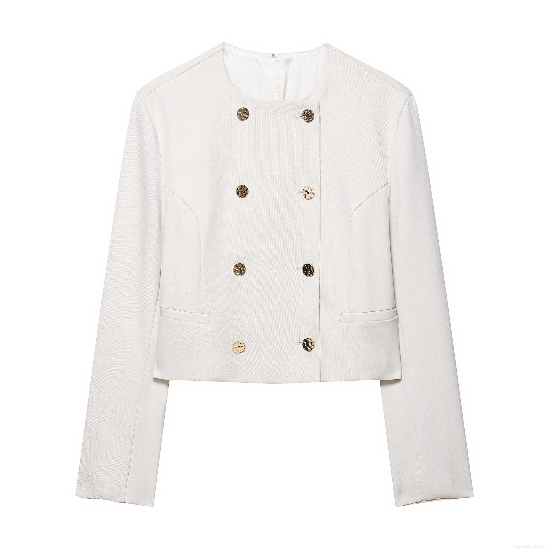 Women's Two-Piece Suit Set Polyester Short Double Breasted Round Neck Jacket High Waist Wide Leg Pants With Golden Chain Belt Elegant Office Daily Outfits