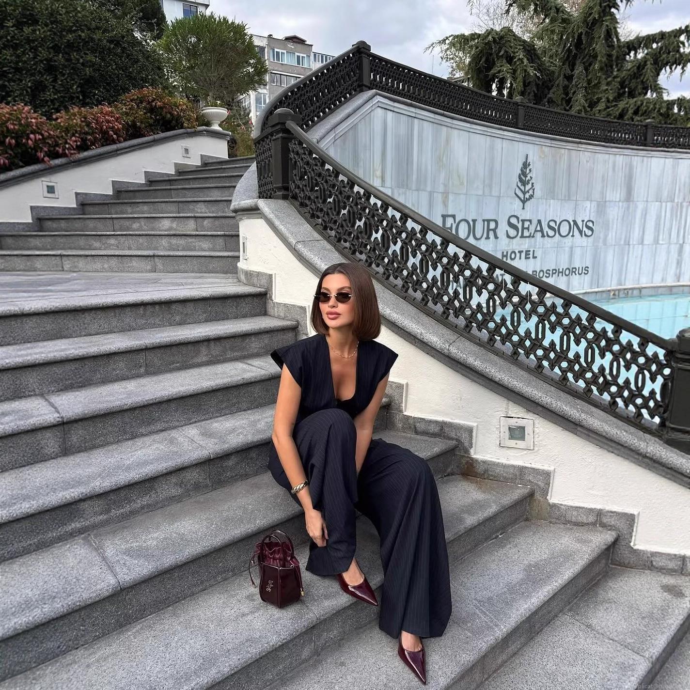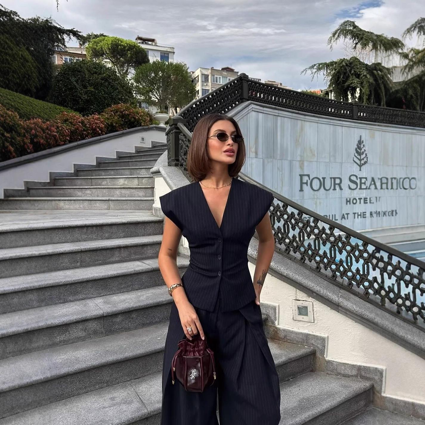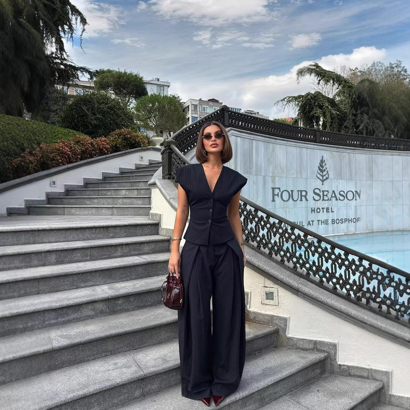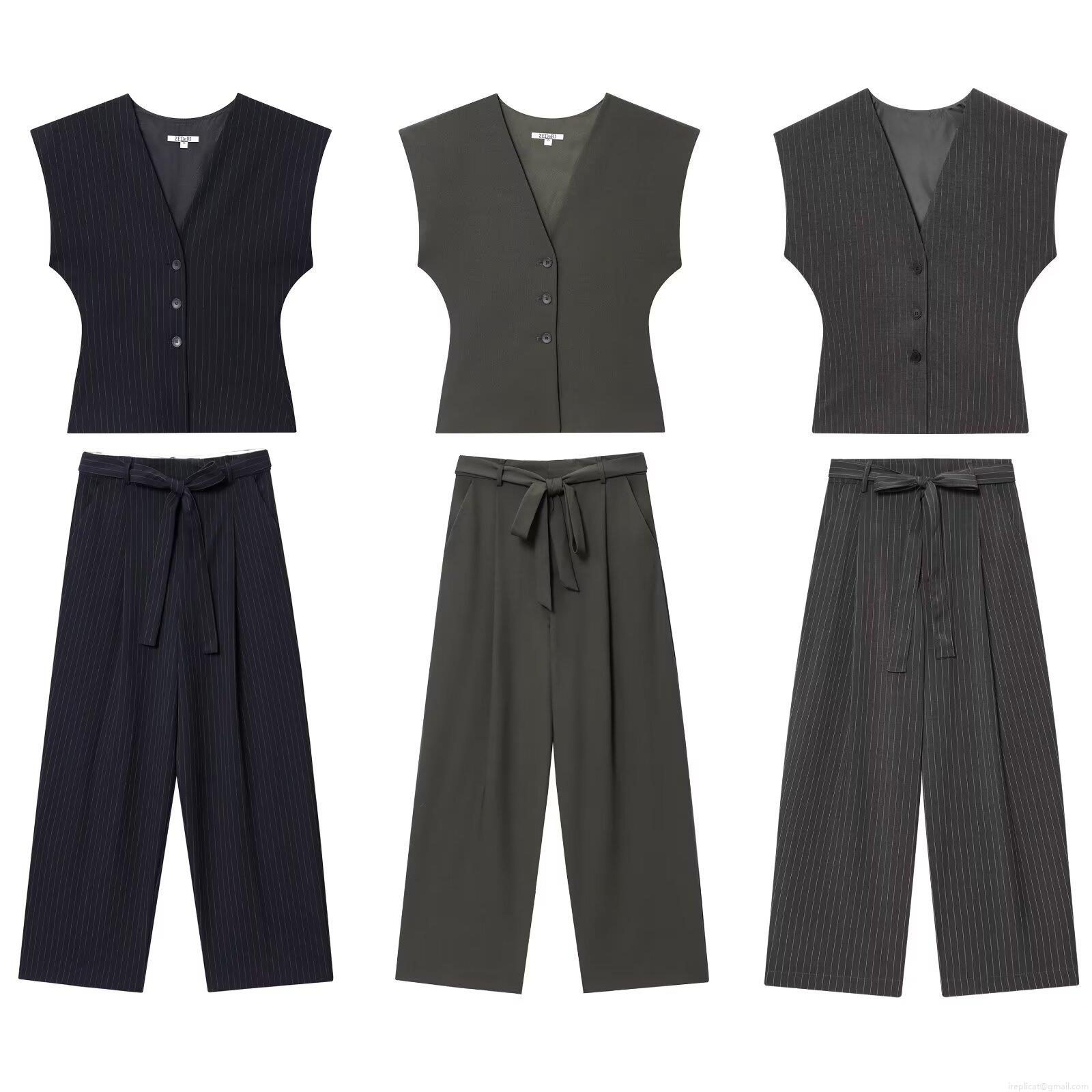 • Women's V Neck Sleeveless Vest And Wide Leg Pants Two Piece Set Striped Solid Commuter Professional Office Lady Suit With Belt