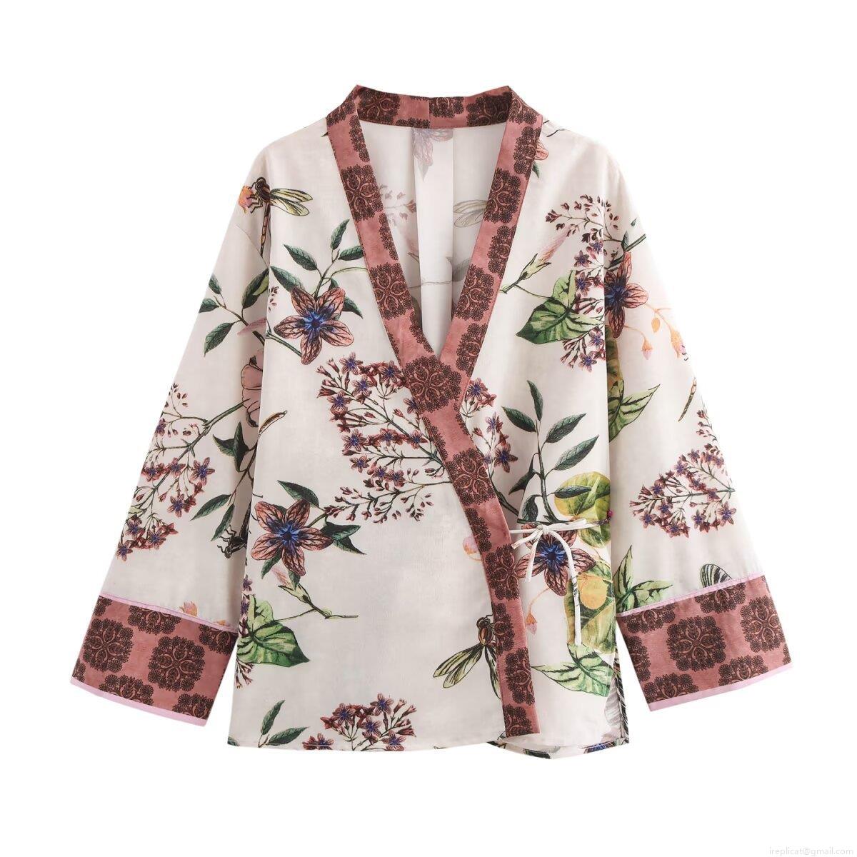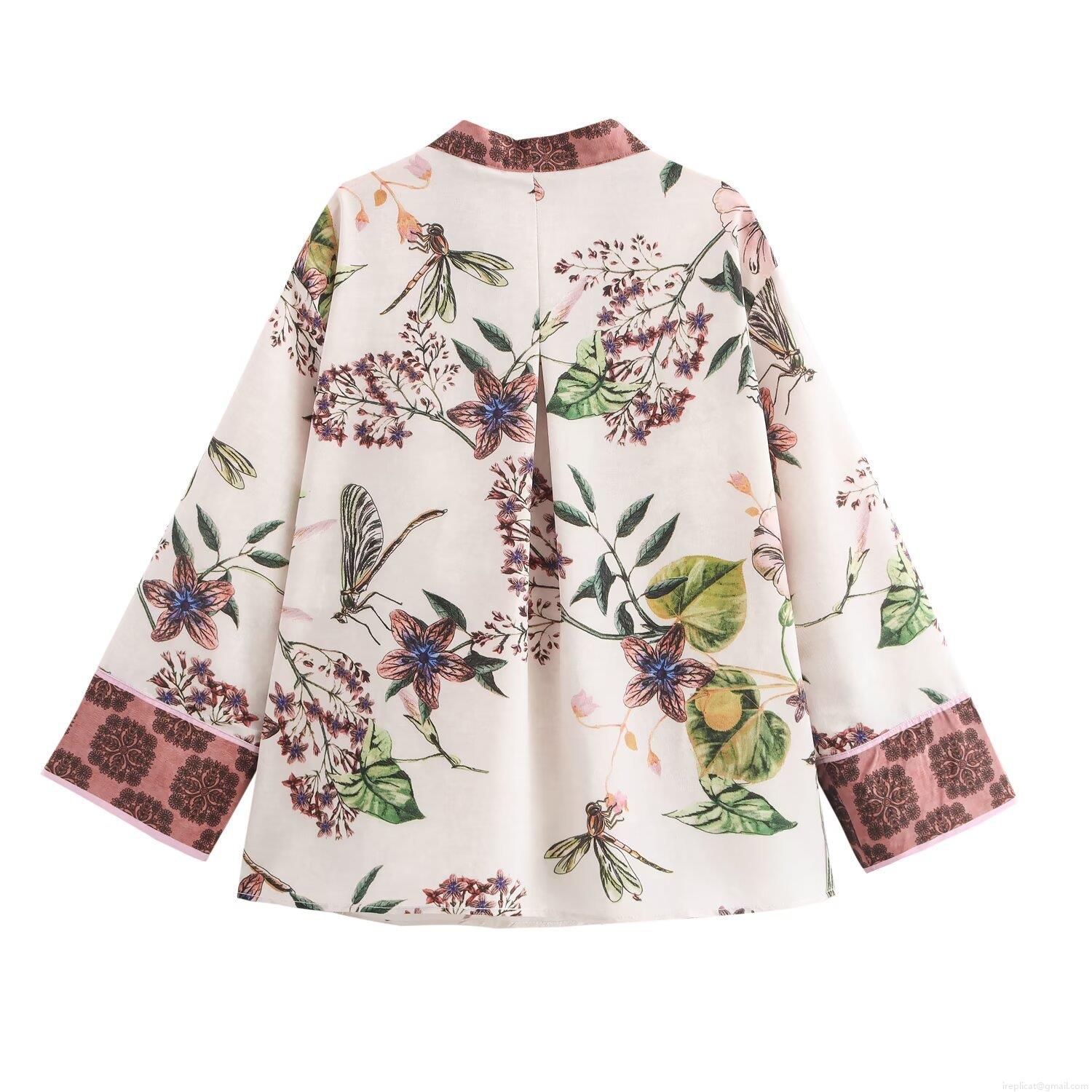 Women's Vacation Floral Print Kimono Wrap Top And Straight Wide Leg Pants Set Vintage Dragonfly Pattern Polyester Two Piece Outfits For Summer Streetwear