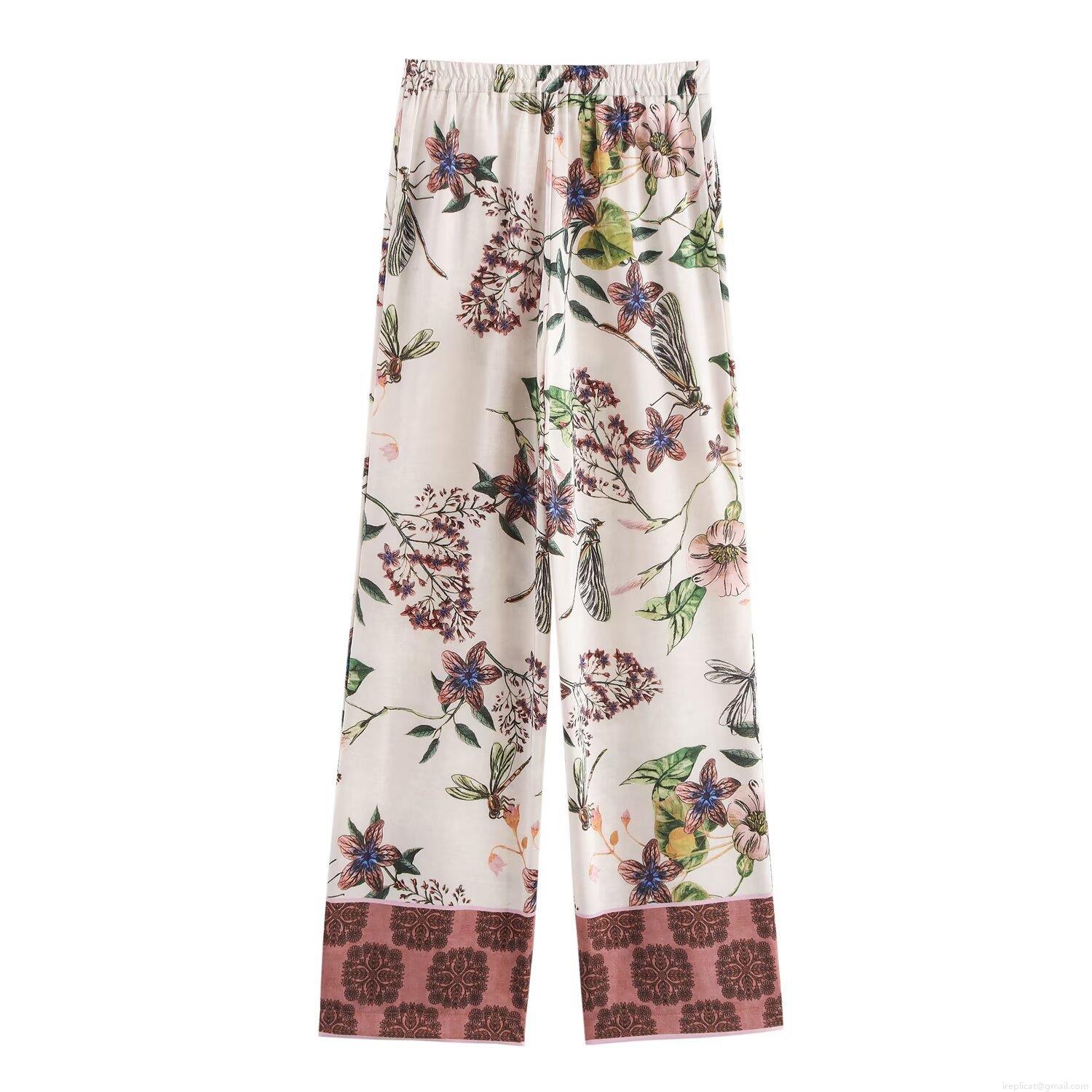 • Women's Vacation Floral Print Kimono Wrap Top And Straight Wide Leg Pants Set Vintage Dragonfly Pattern Polyester Two Piece Outfits For Summer Streetwear