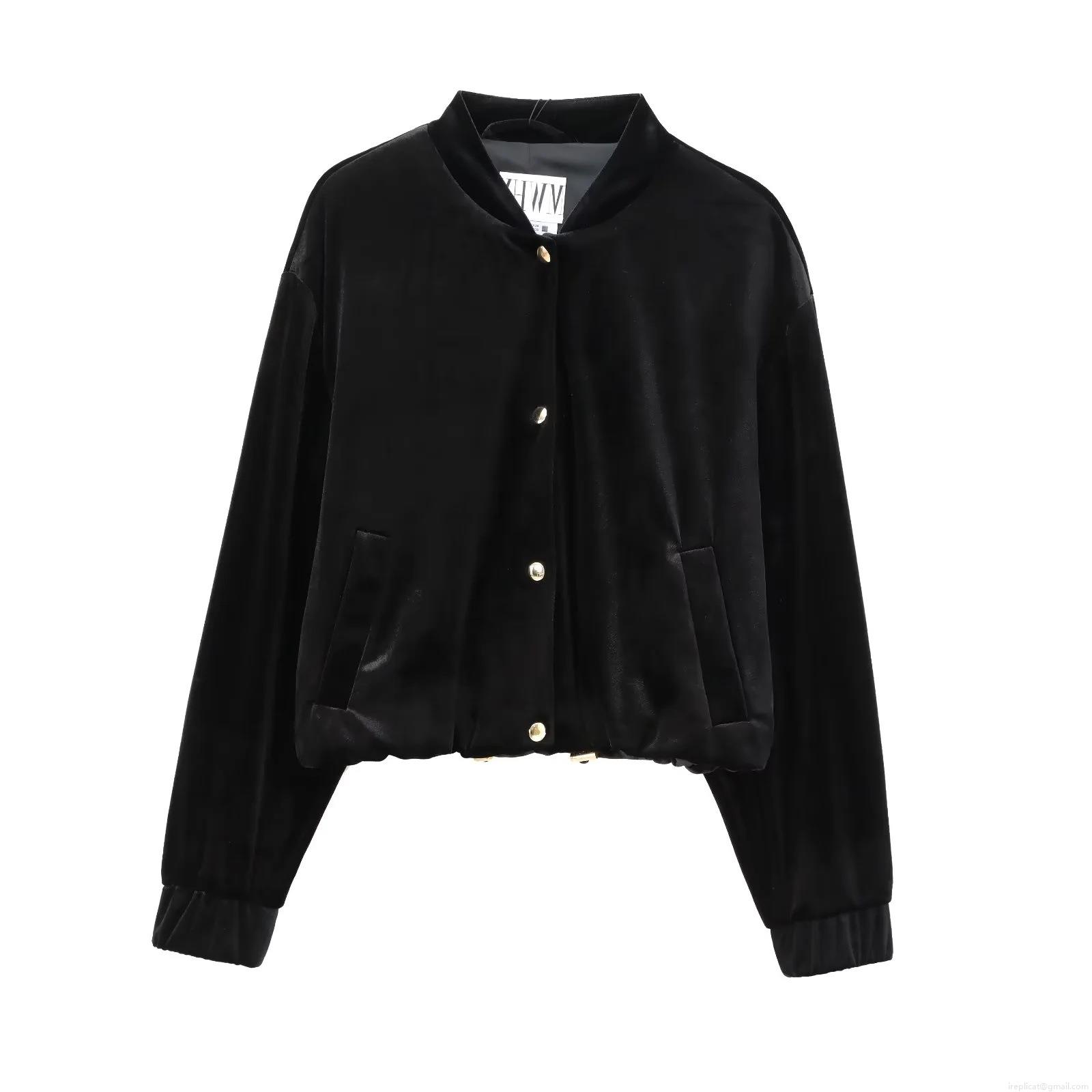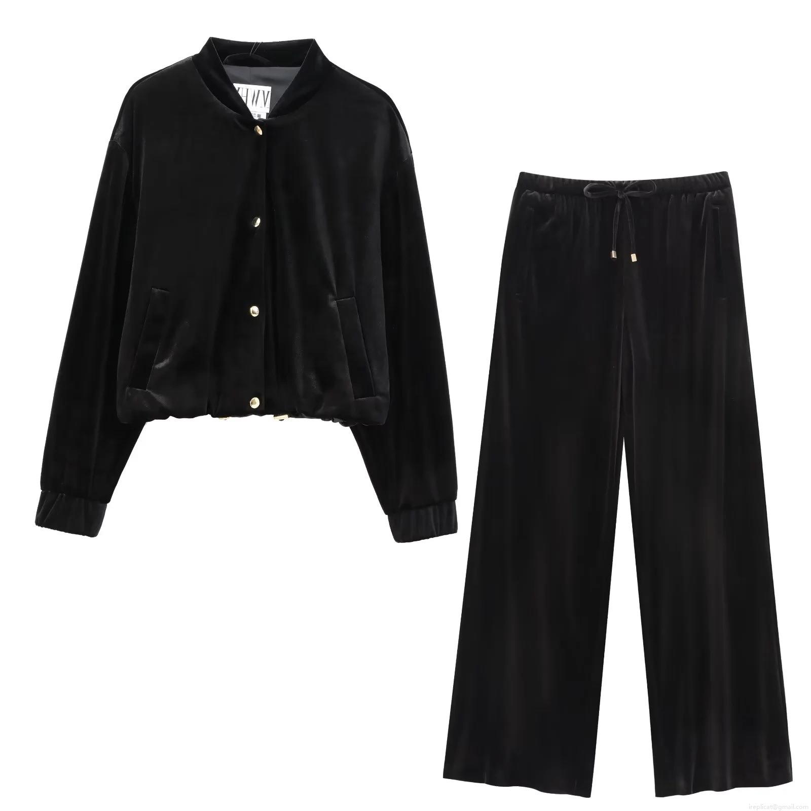 Women's Velvet Bomber Jacket And Wide Leg Pants Set Solid Color Gold Buttons Casual Two Piece Outfits For Streetwear Party