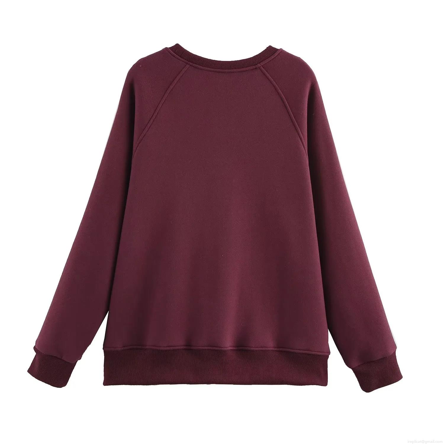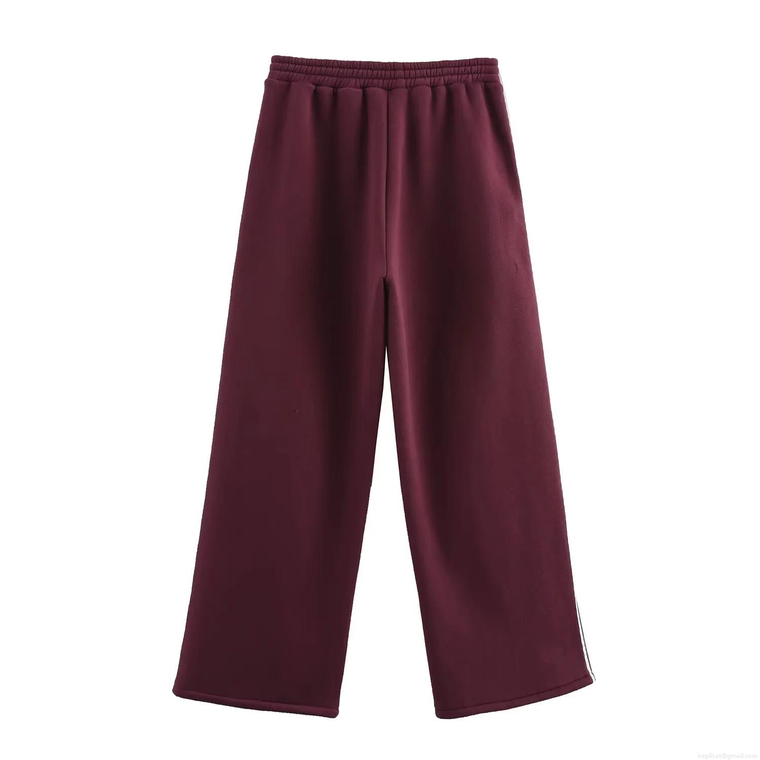 • Women's Vintage Burgundy Fleece Sweatshirt Pants Casual Set With White Lace Patchwork Round Neck Long Sleeve Top And Wide Leg Side Stripe Trousers Letter Embroidery Loungewear