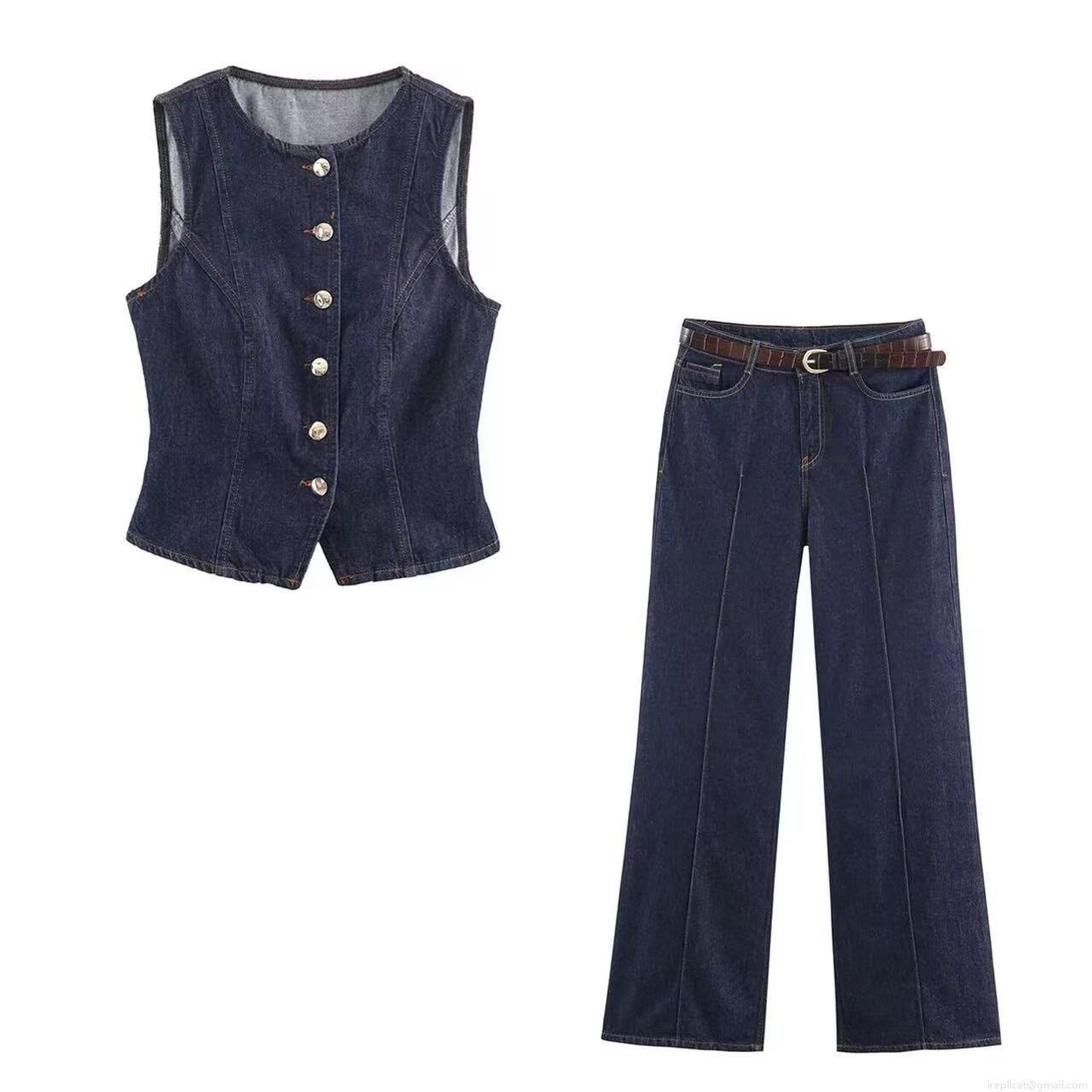Women's Vintage Denim Vest And High Waist Pants Set Sleeveless Button Down Waistcoat With Belt Straight Leg Trousers Casual Streetwear Two Piece Outfit