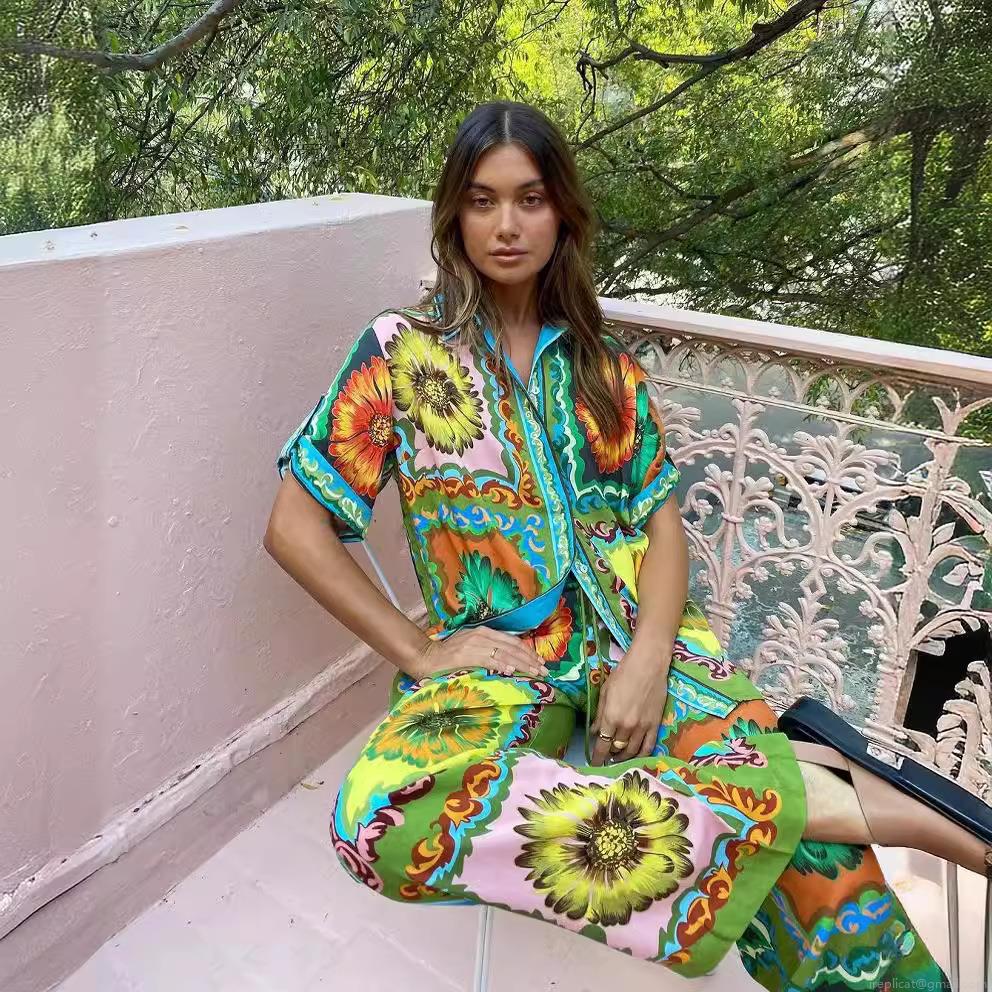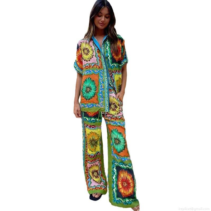 • Women's Vintage Sunflower Baroque Print 2 Piece Set Vacation Short Sleeve Lapel Shirt And Wide Leg Pants Casual Summer Outfits
