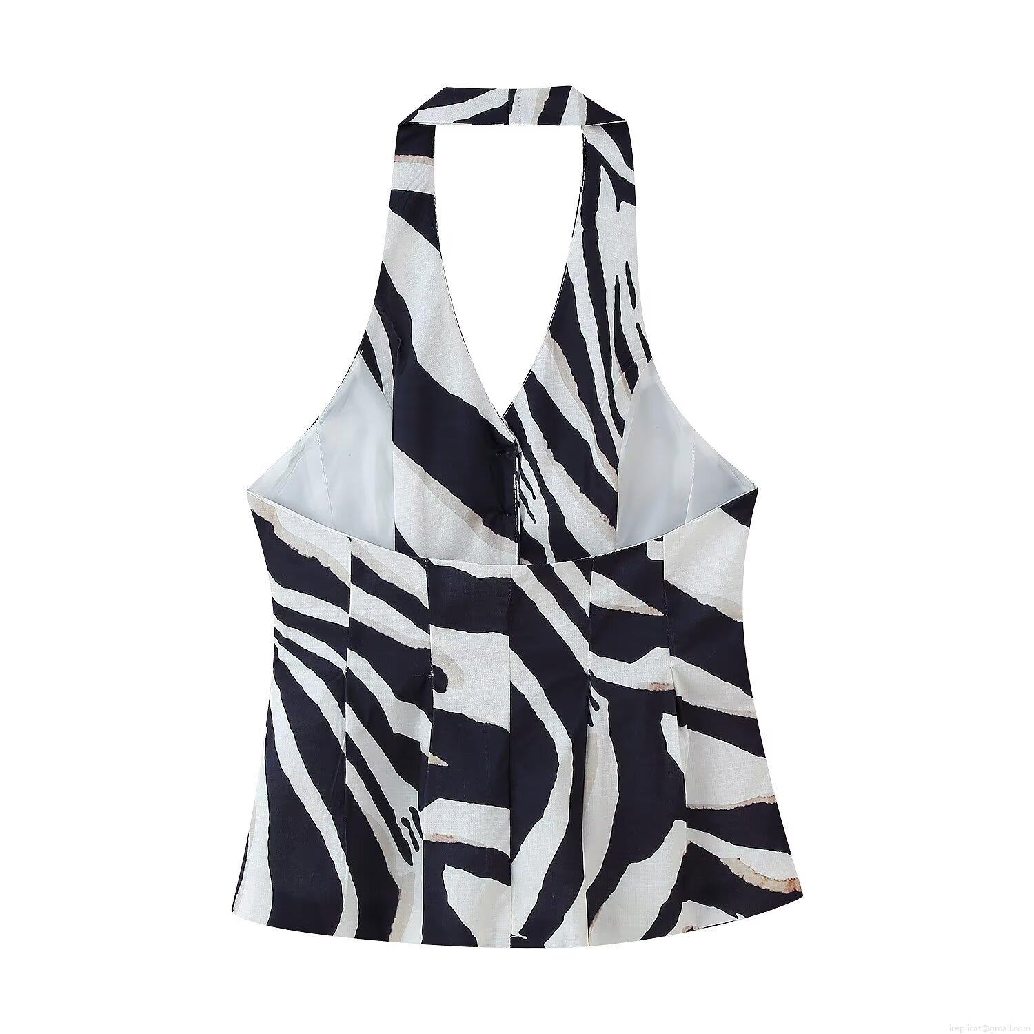 • Women's Zebra Print Two Piece Set Polyester Sleeveless Halter Neck Button Vest Top And Wide Leg Pants Casual Summer Streetwear Chic Outfit