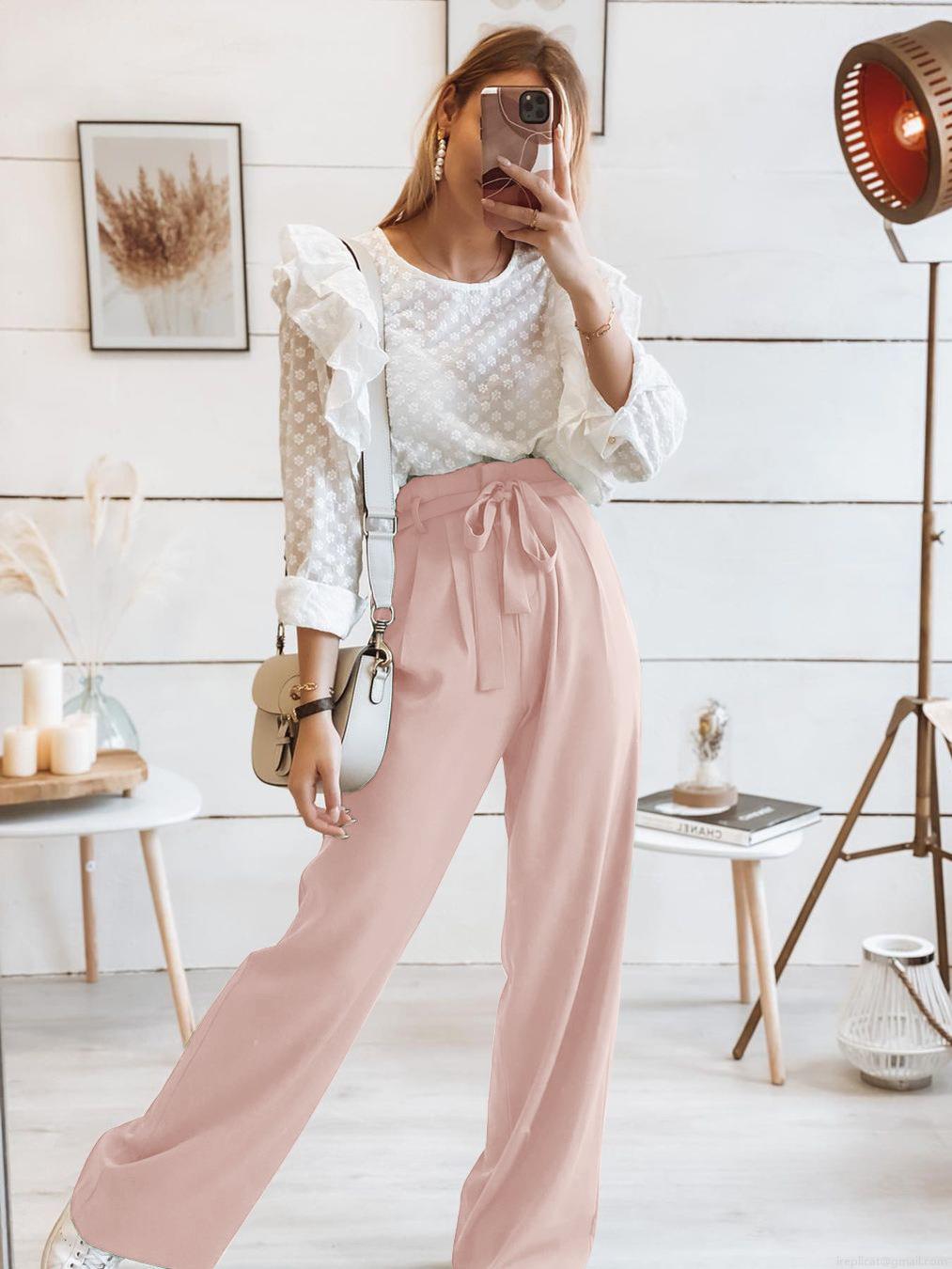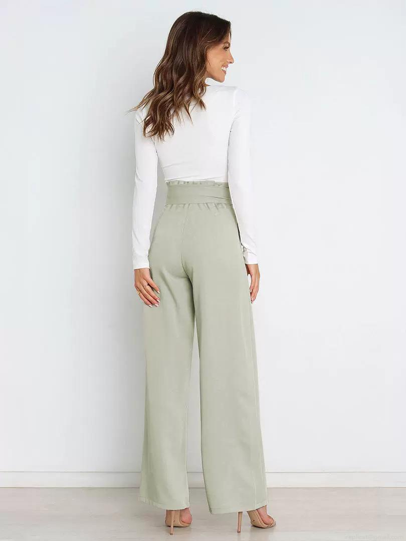 Solid Color, Bow, Belt, Lace, Wide-leg, High-waisted