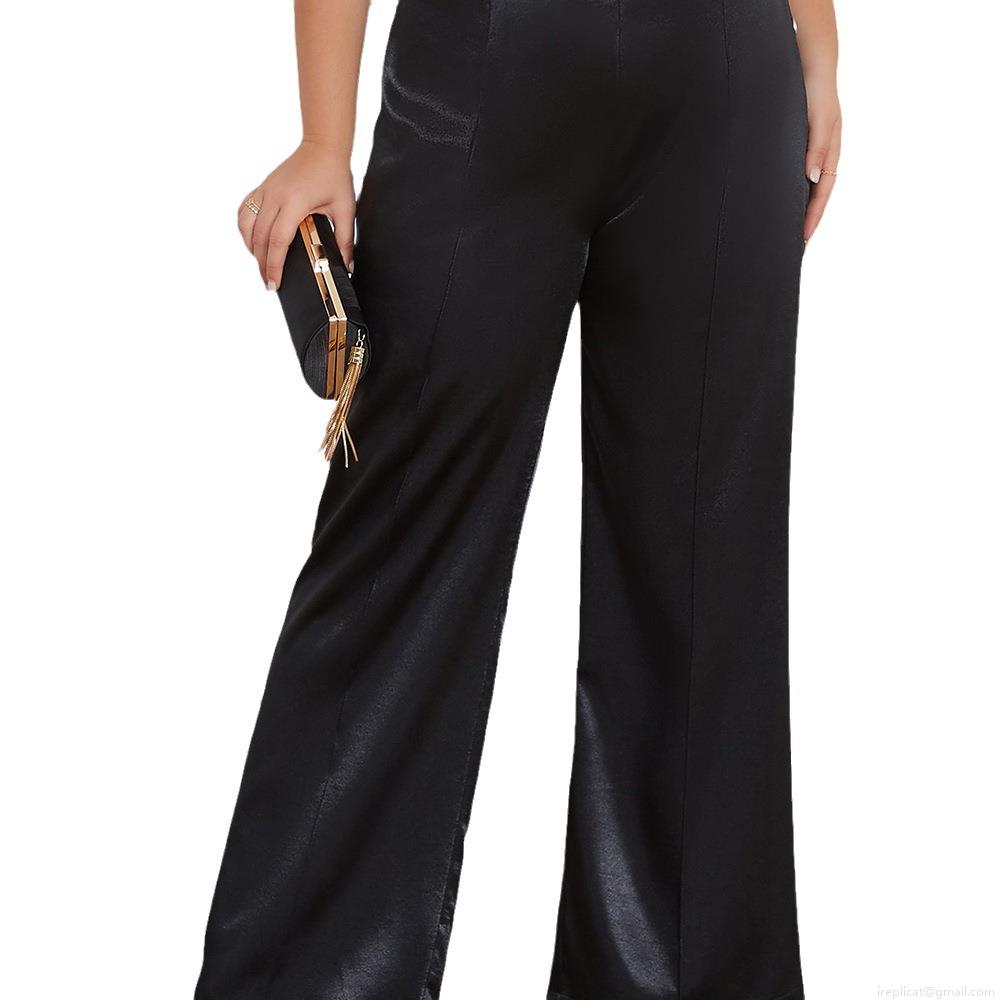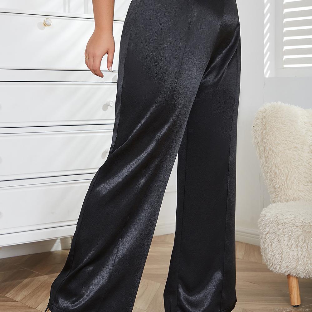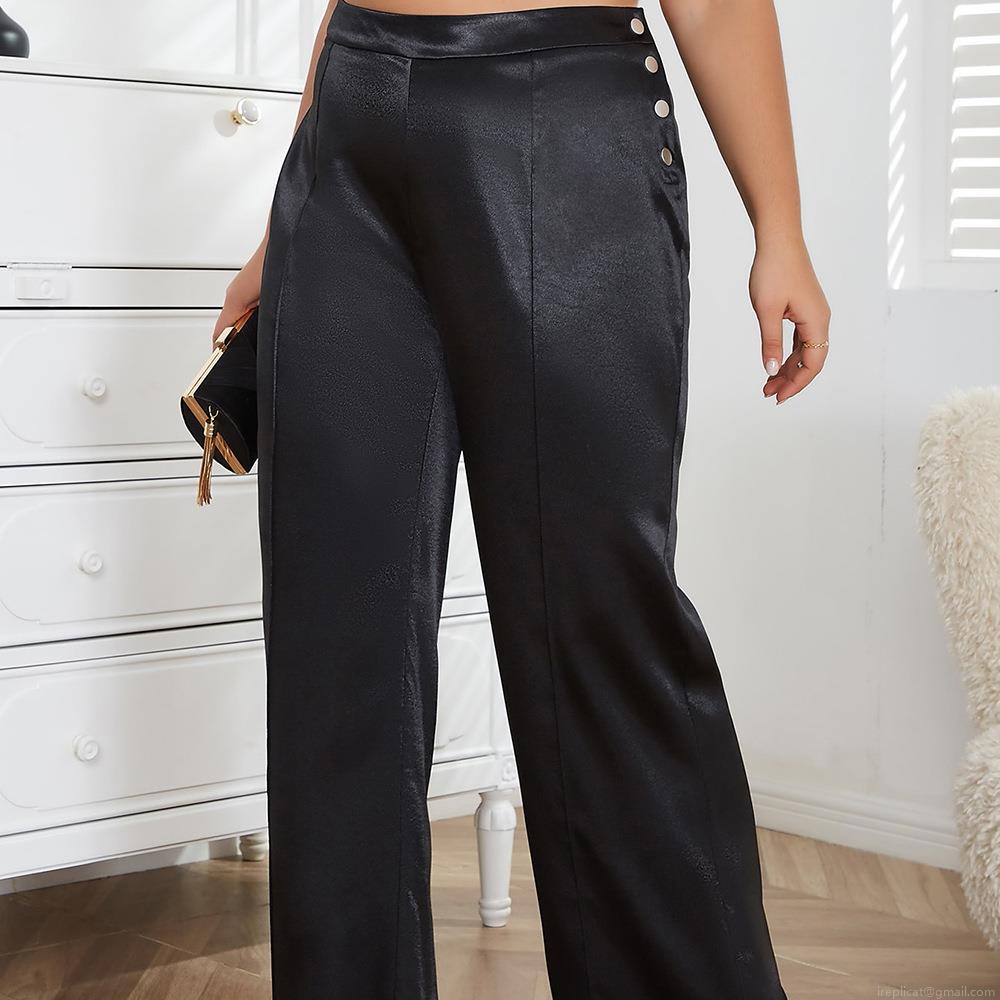 • Plus Size Women's Satin Wide-Leg Pants High Waist Loose Elegant Trousers with Side Metal Buttons Solid Black Silk-Like Commuting Plus Size Bottoms for Summer Party Office