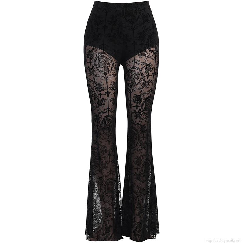 • Women Gothic Black Lace Flared Pants High Waist Mesh Flocking Cross Portrait Print Bell Bottom Trousers Sexy Streetwear Party Clubwear Slender Fit