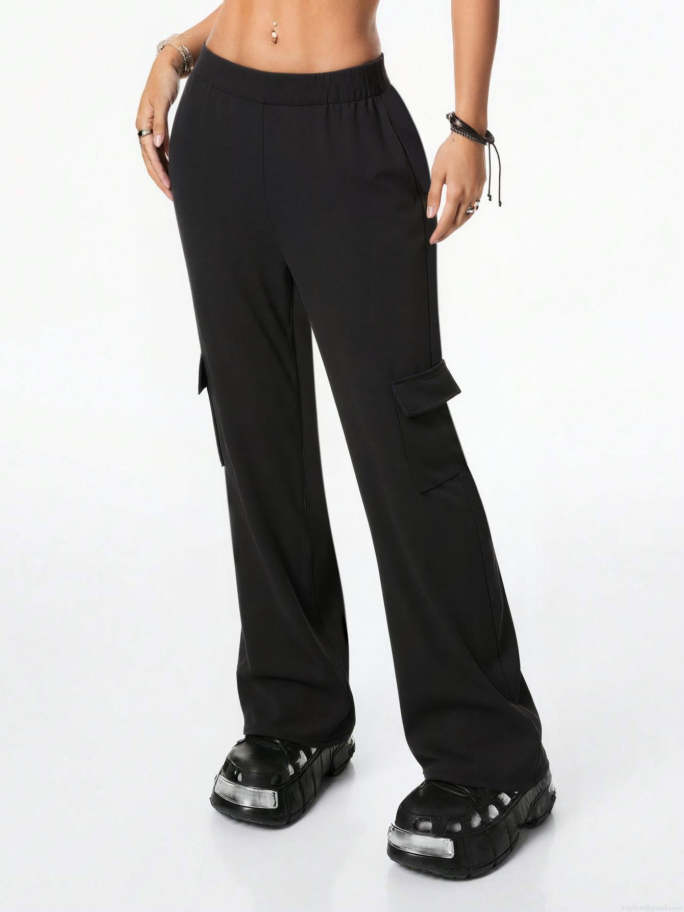 • Women High Waist Cargo Flare Pants Elastic Waist Solid Black Trousers With Side Large Pockets Fashion Casual Streetwear For Ladies 95% Polyester 5% Elastane
