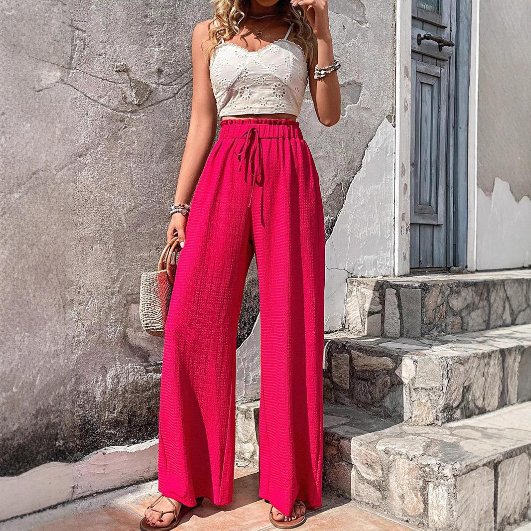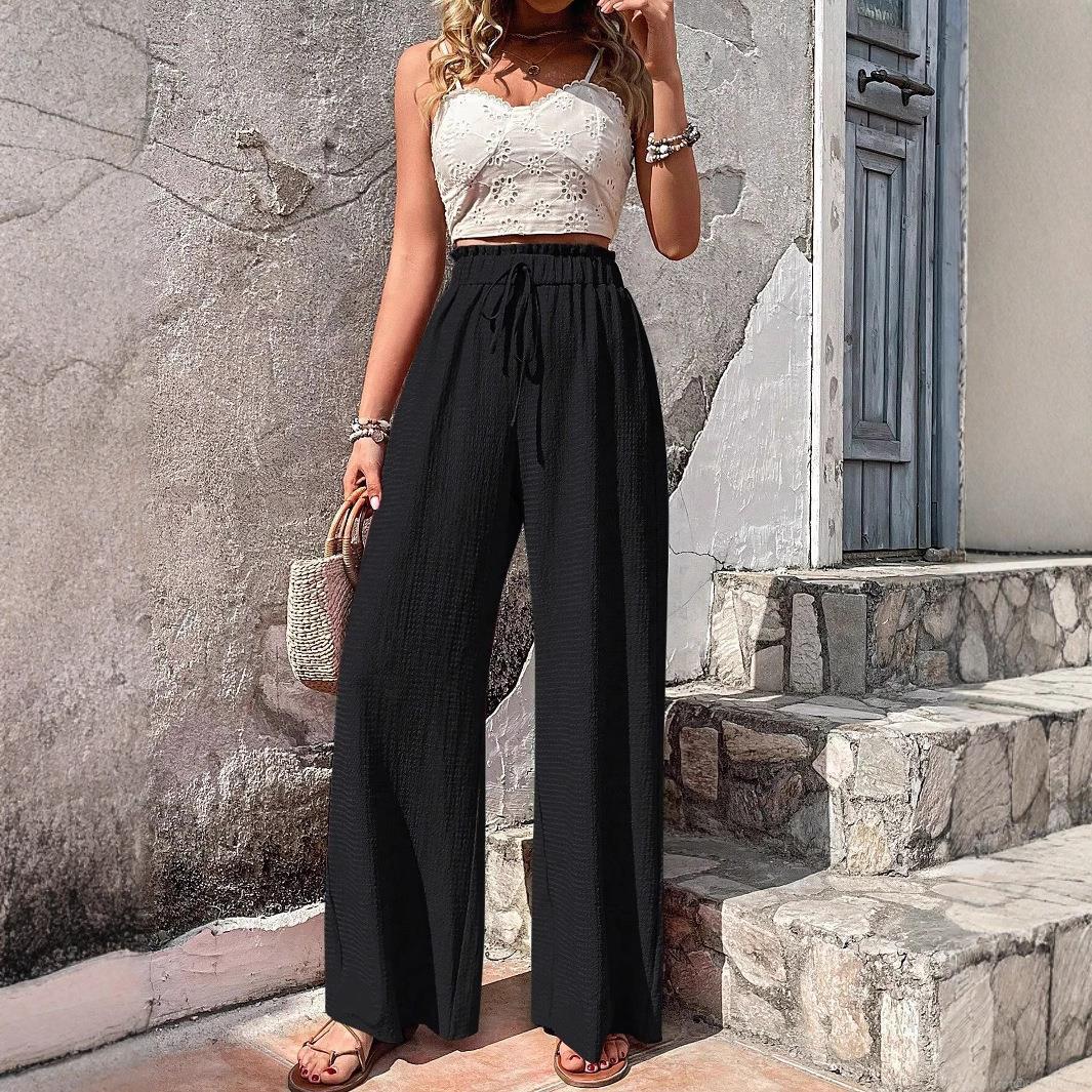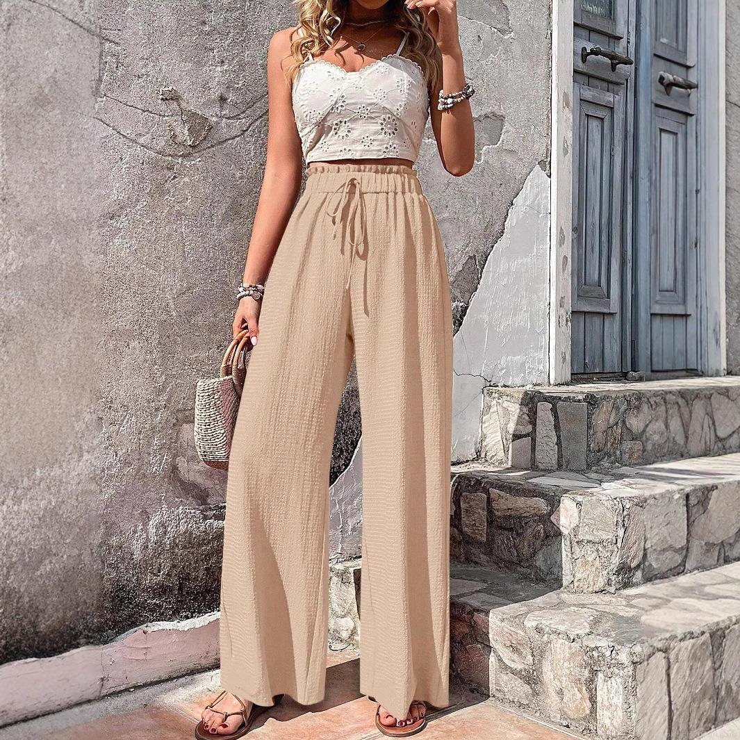 • Women High Waist Wide Leg Pants 100% Polyester Seersucker Bubble Grid Drawstring Elastic Waist Casual Loose Long Trousers For Summer Vacation Beach Daily Wear Boho Western Style