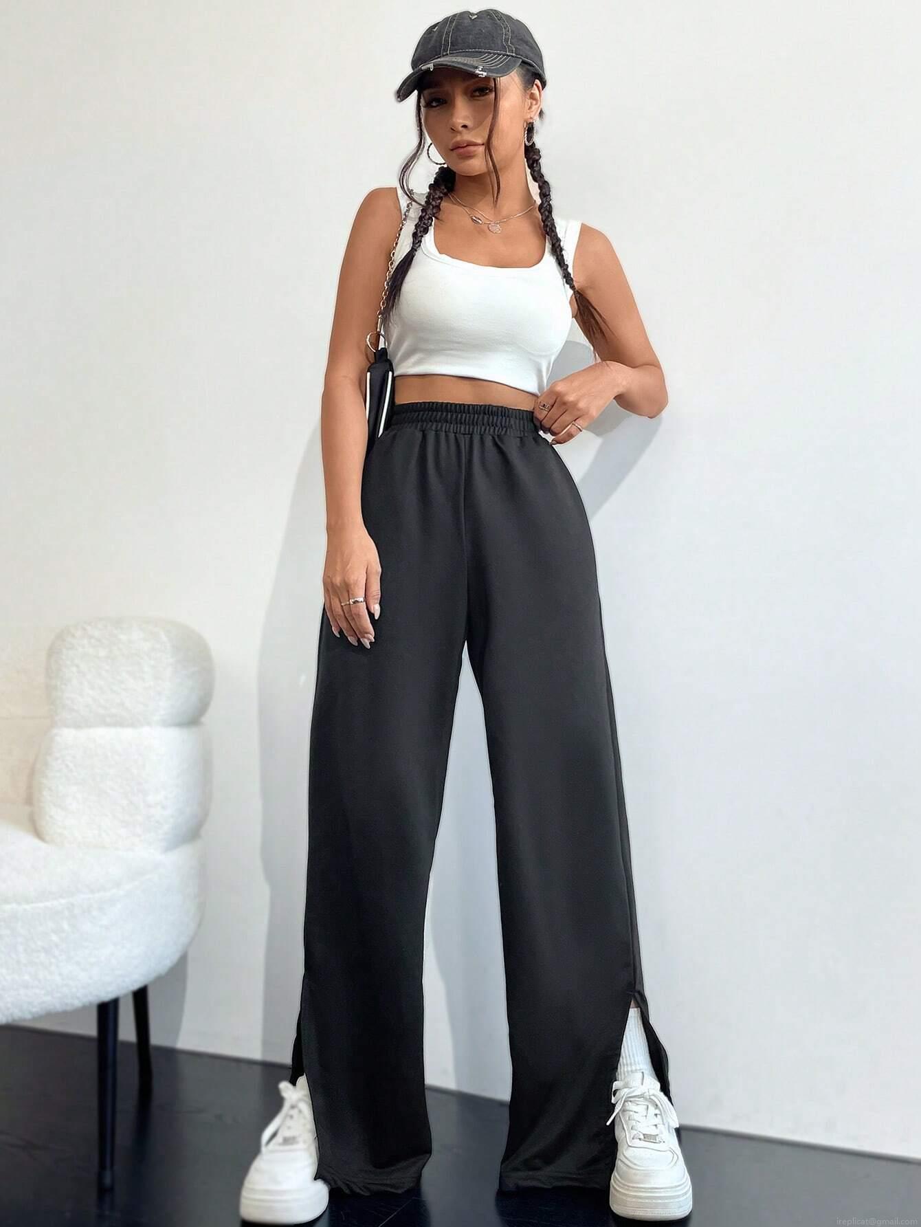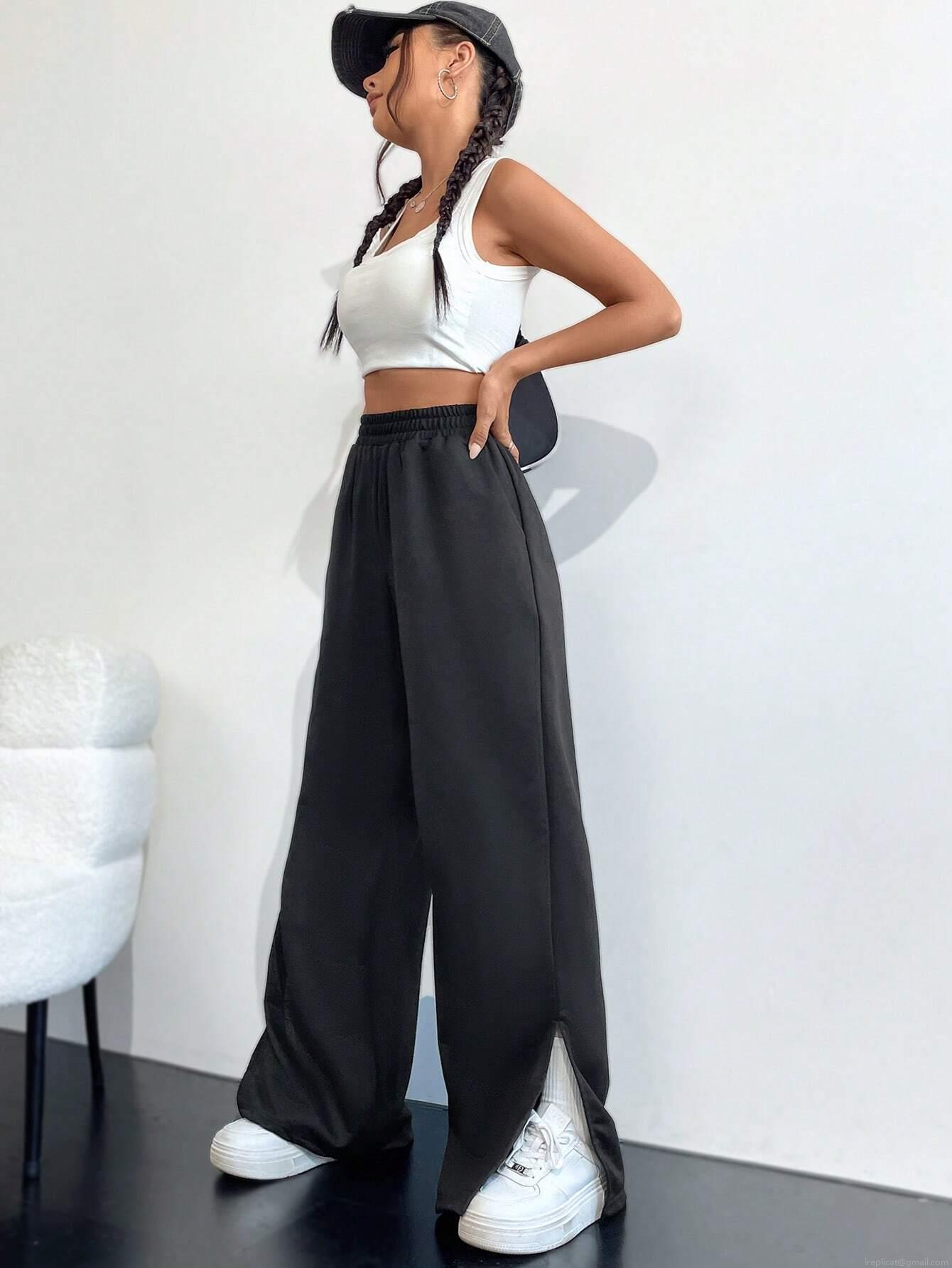 • Women High Waist Wide Leg Sweatpants Side Slit Polyester Cotton Blend Casual Loose Long Pants Elastic Waist Fall Winter Fashion Streetwear for Women