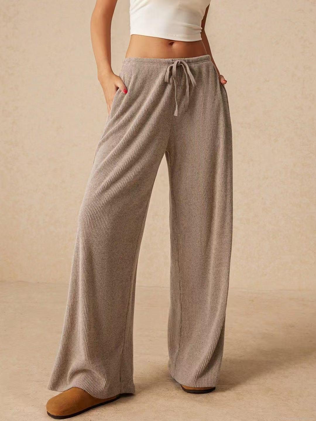 • Women High Waisted Wide Leg Pants Ribbed Knit Drawstring Elastic Waist Loose Casual Long Trousers Solid Color Comfy Loungewear Fall Winter