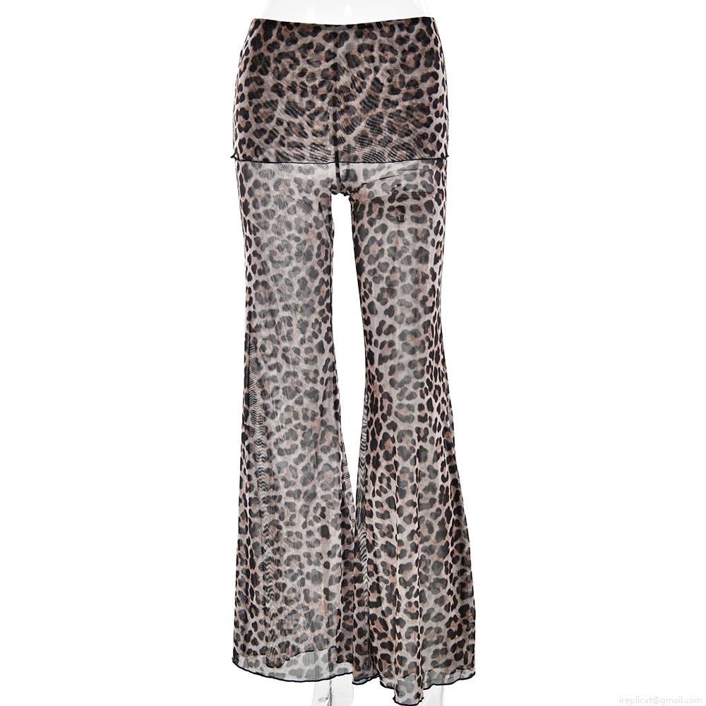 Women Sexy Mesh Flare Pants See-Through Leopard Polka Dot High Waisted Long Trousers Clubwear Summer Sheer Mesh Print Fashion Trousers