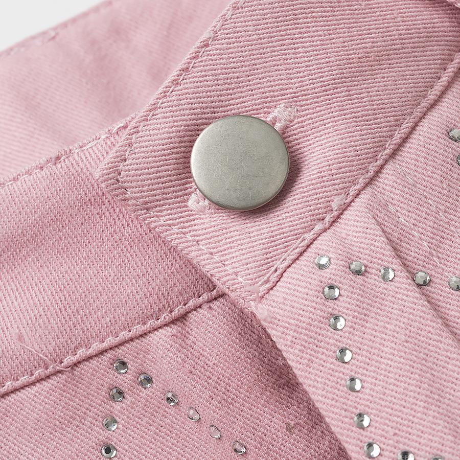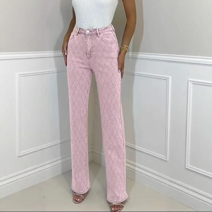 • Women Y2K Pink Rhinestone Straight Leg Pants Diamond Lattice Pattern Mid Waist Casual Trousers Streetwear Polyester Trousers With Water Diamond Decoration For Women