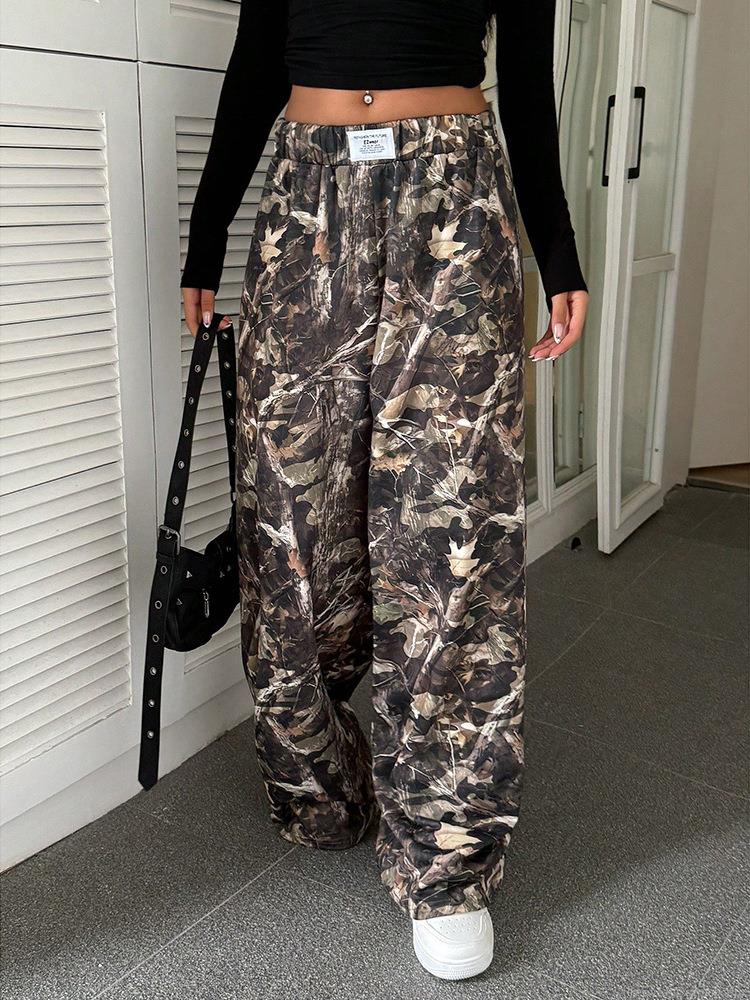 Pocket, Camouflage, Printing, Elastic Waistband, Tree Branch Pattern, Fabric Label Decoration, Leaf Pattern