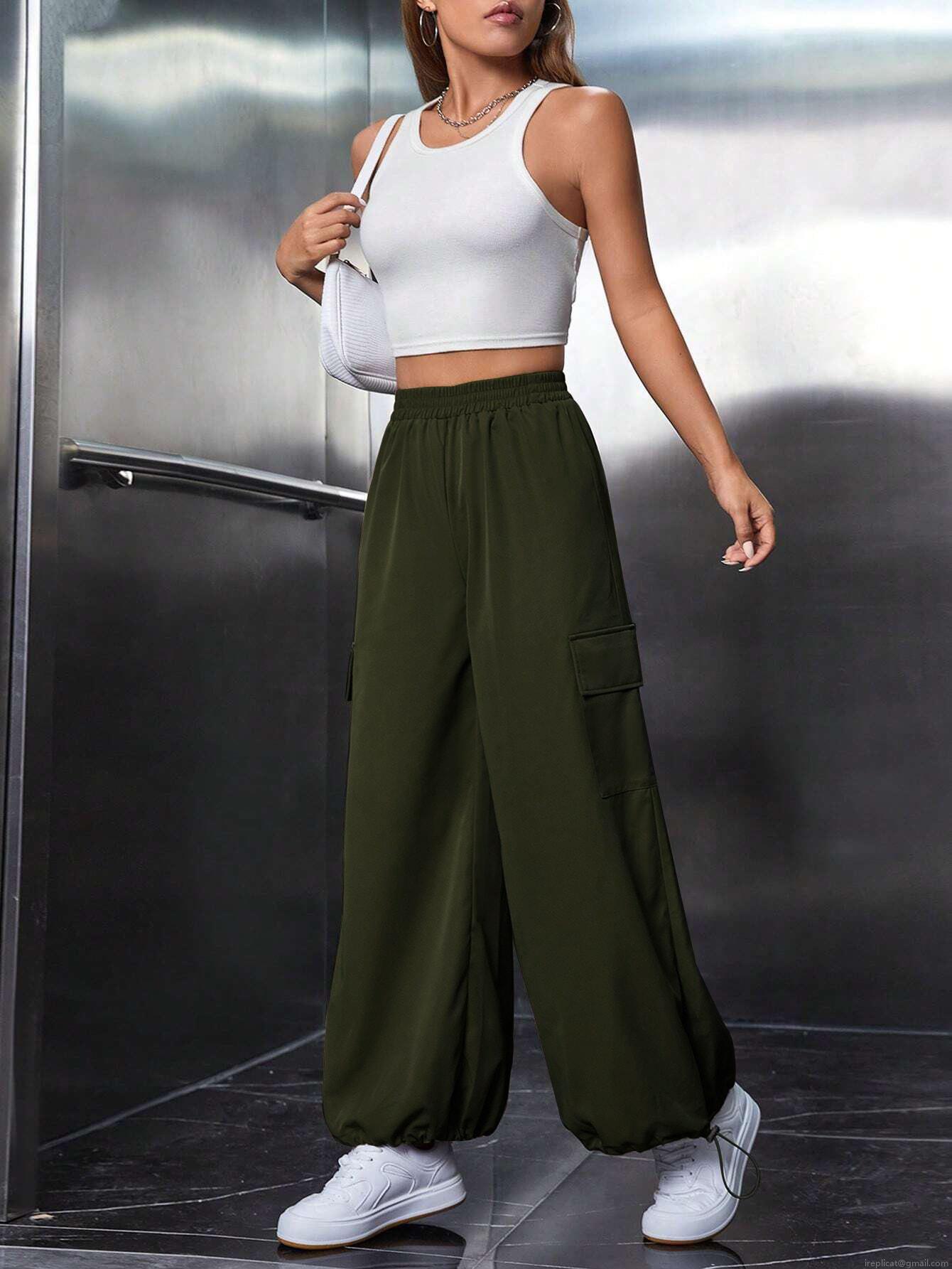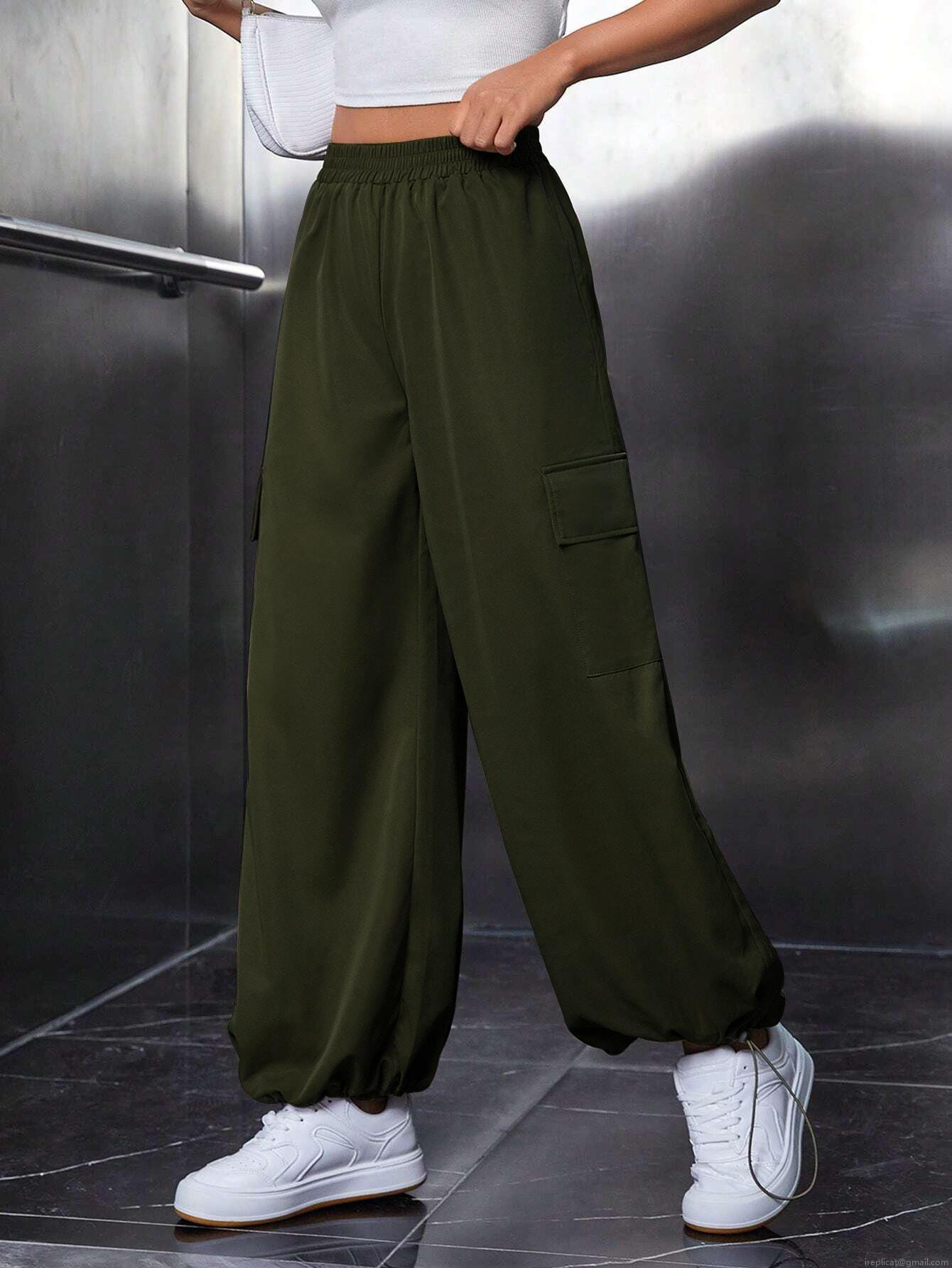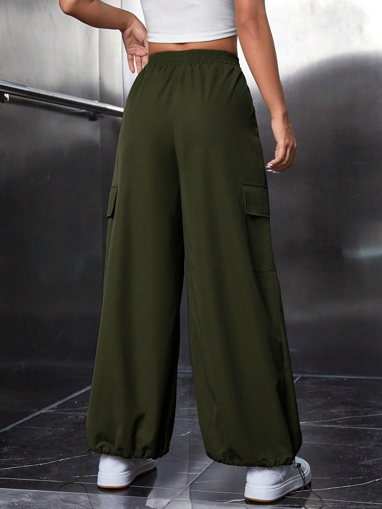 • Women's Cargo Pants 100% Polyester Wide Leg Baggy Trousers Elastic Waist Drawstring Hem Multi-Pocket Utility Streetwear Casual Military Green Pants For Women