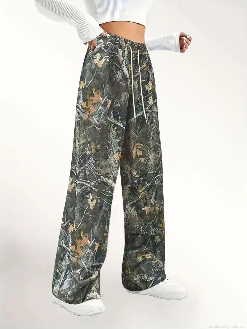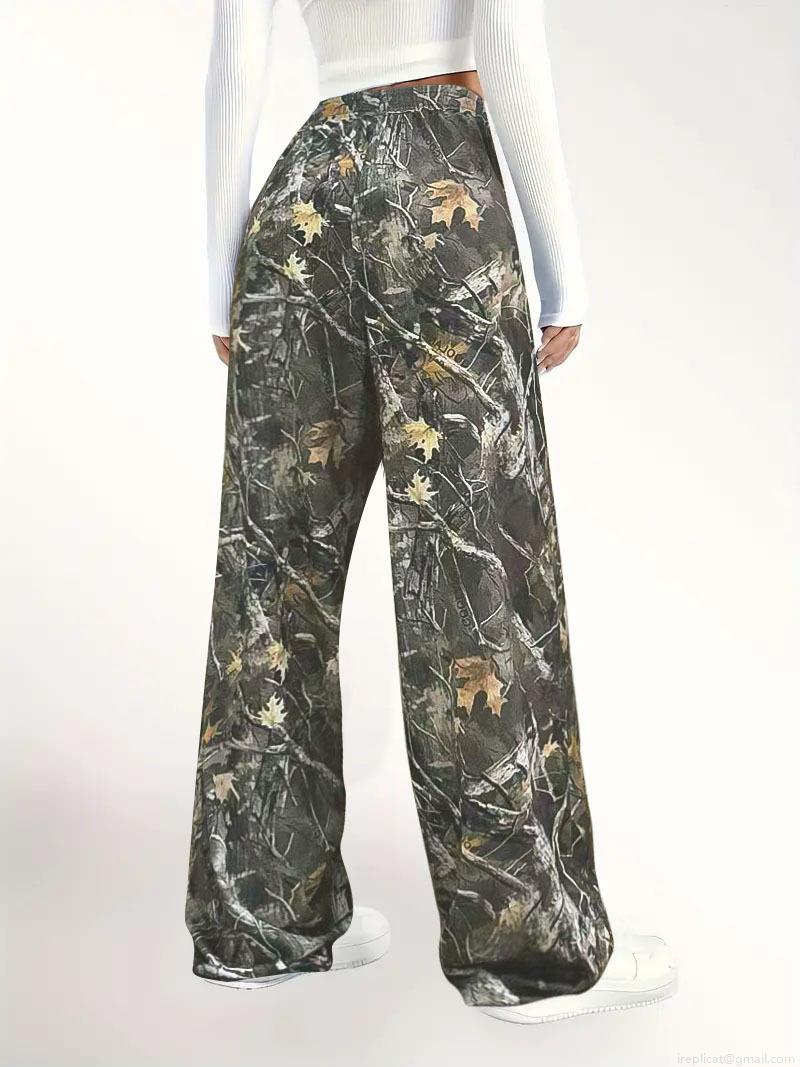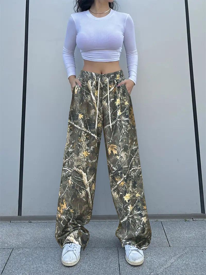 Camouflage, Printing, Drawstring, Wide-leg, High-waisted, Forest Leaves