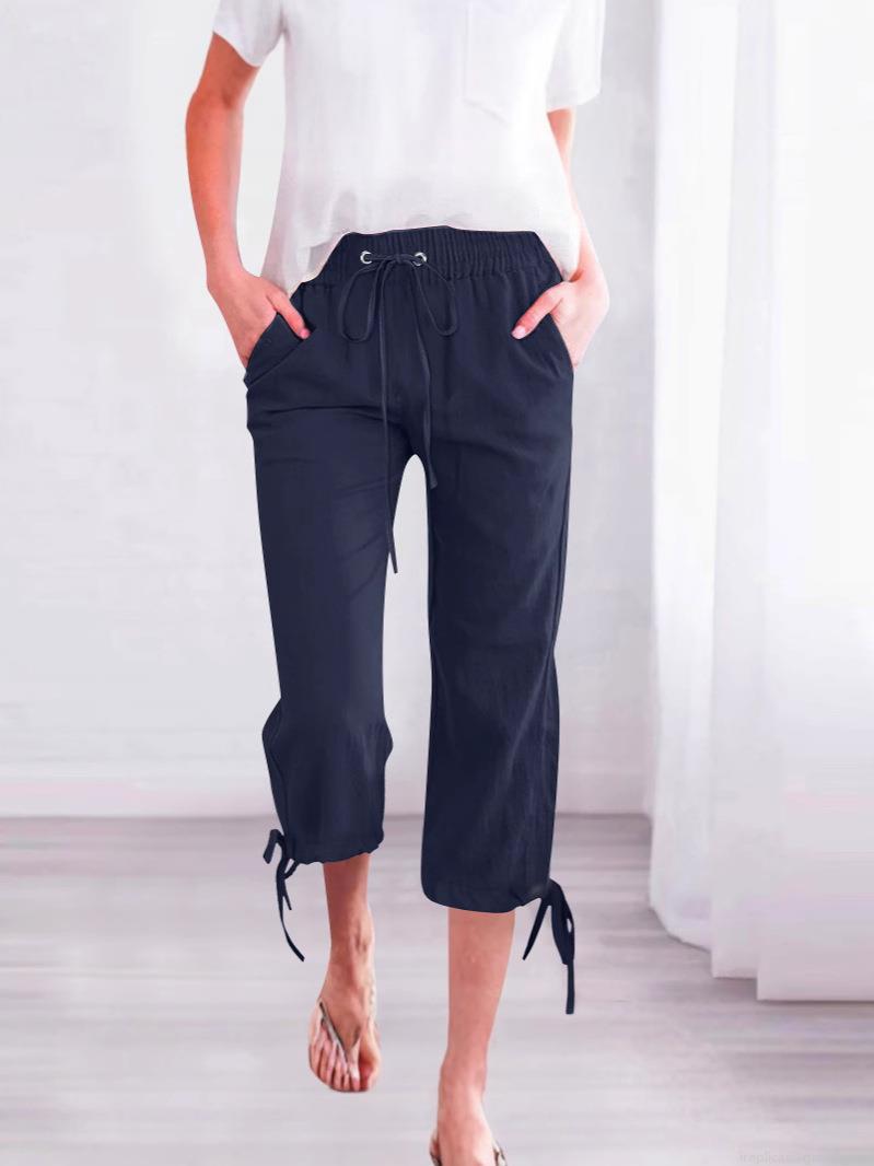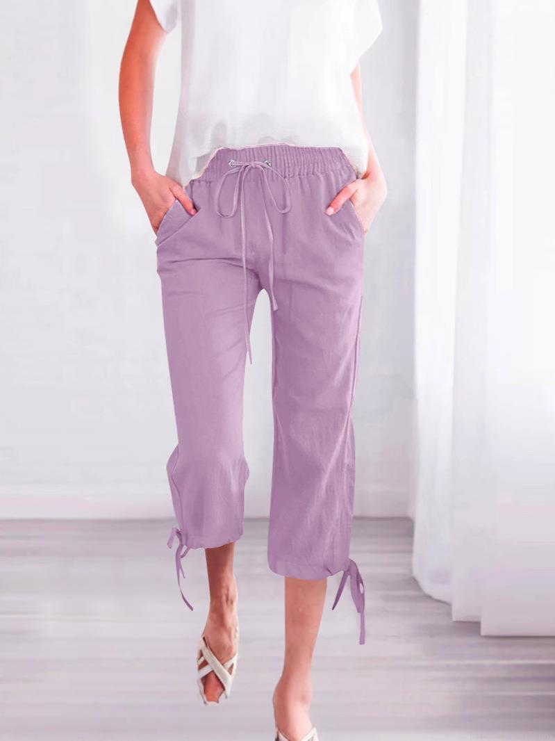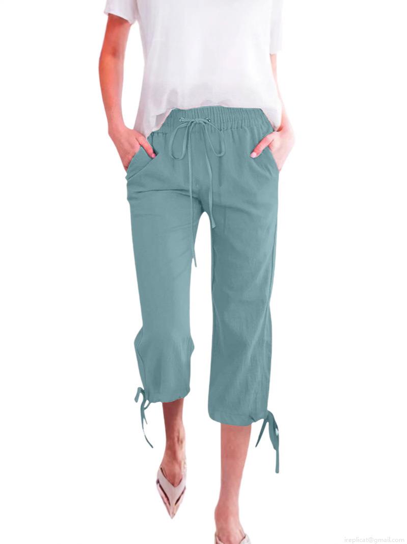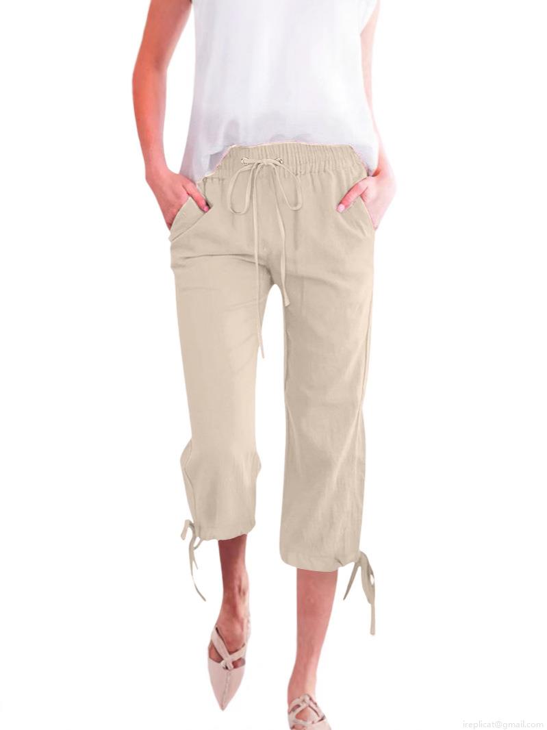 • Women's Casual Cotton Linen Wide Leg Capri Pants Loose Elastic Waist Drawstring Solid Color Cropped Trousers With Pockets And Tie Hem