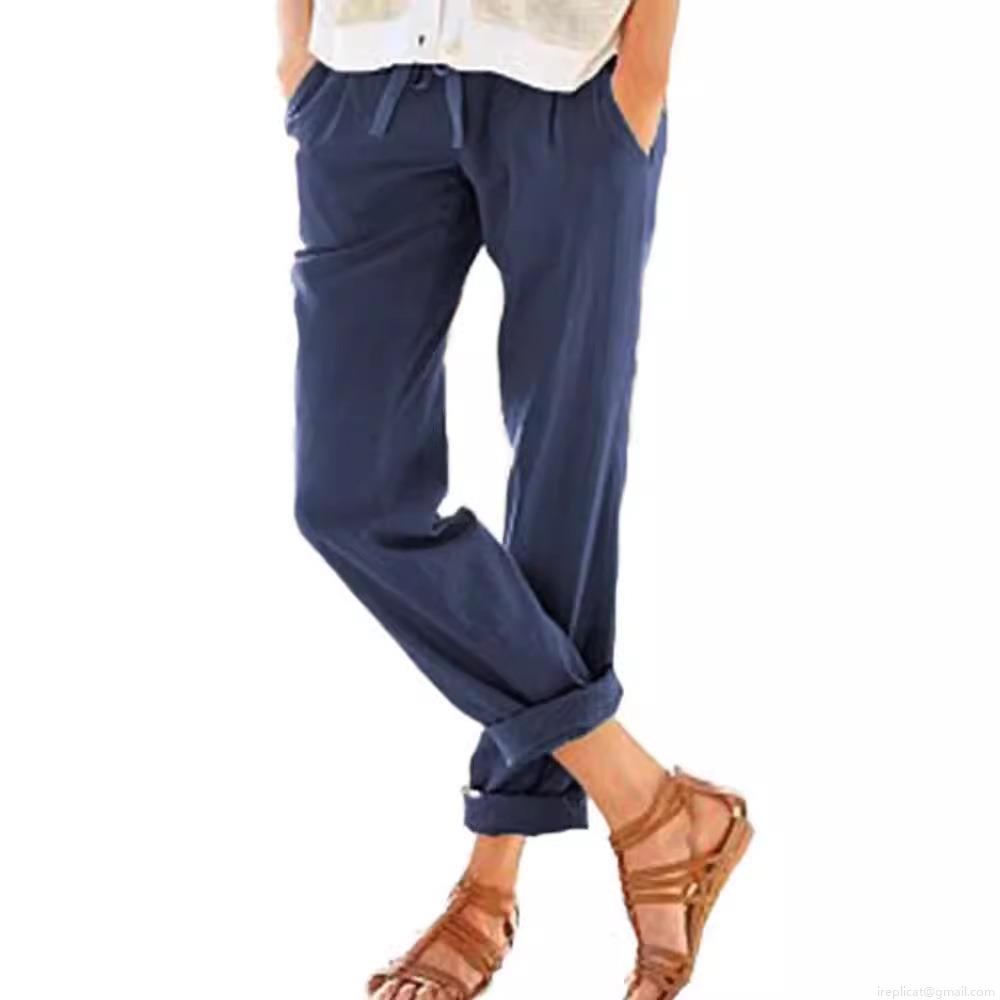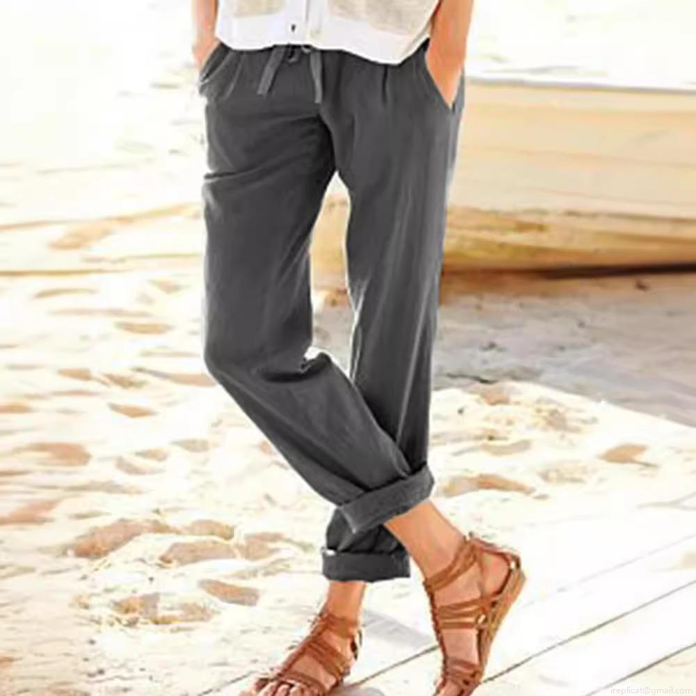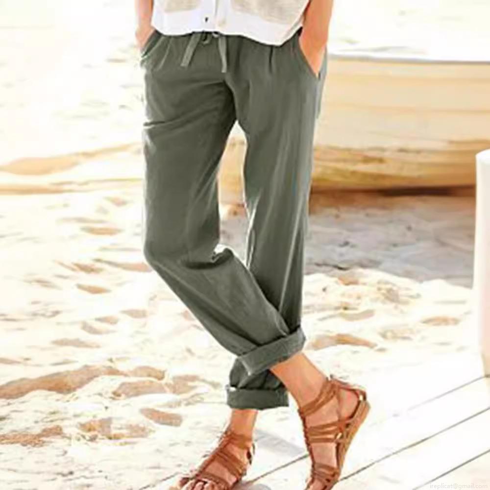 • Women's Casual Cotton Linen Wide Leg Pants Solid Color Drawstring Elastic Waist Loose Trousers With Pockets For Summer Beach Vacation