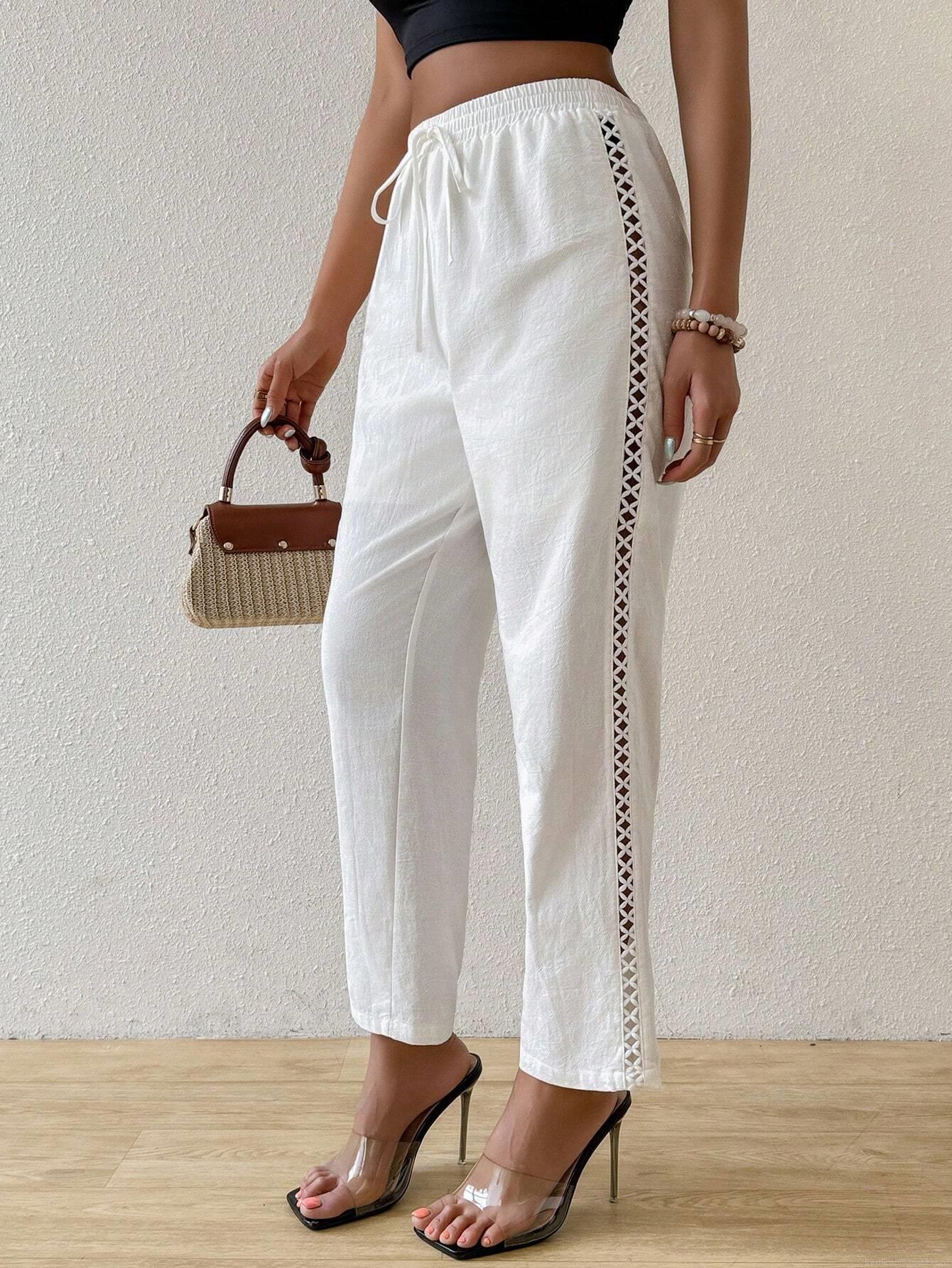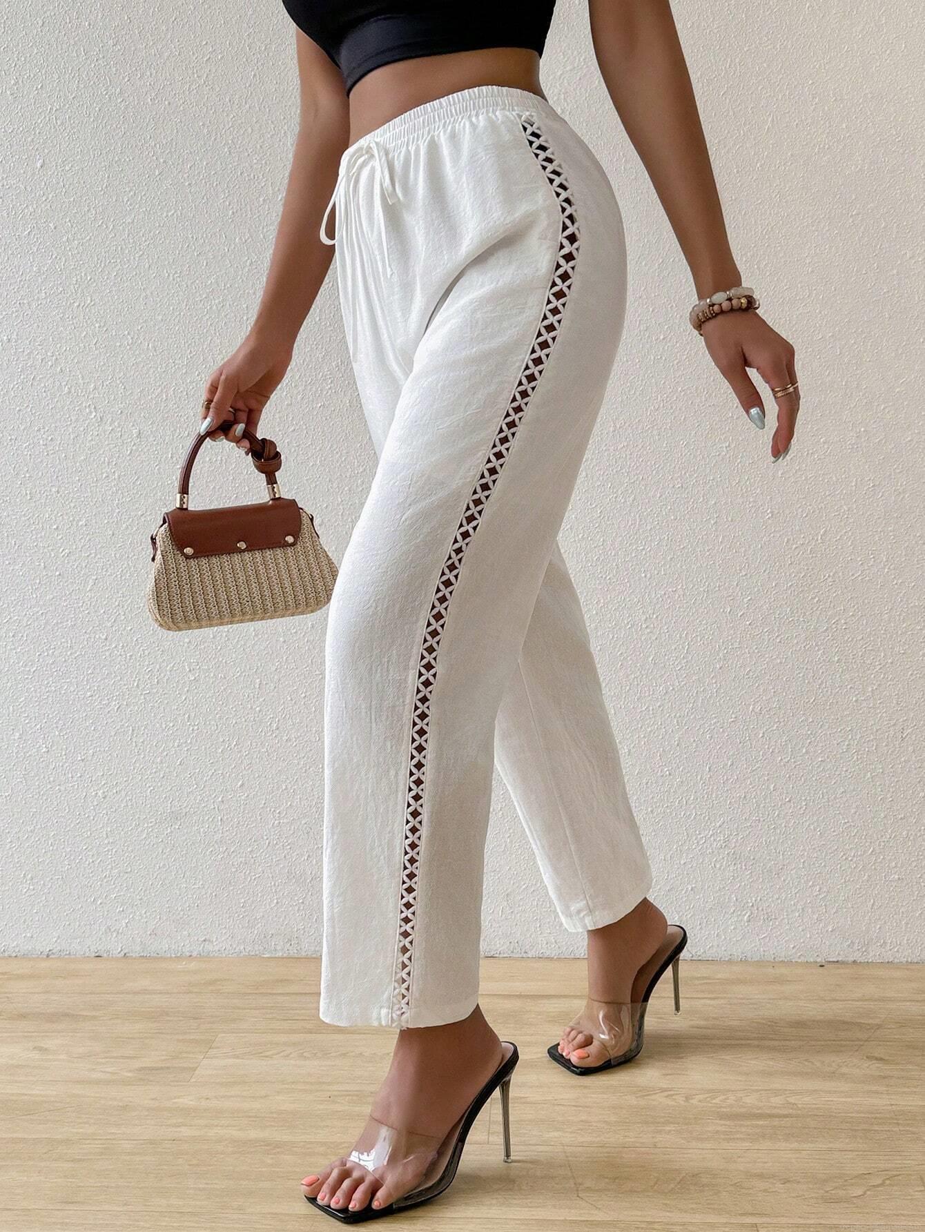 • Women's Casual Cotton Straight Leg Pants With Hollow Out Side Design Elastic High Waist Drawstring Trousers For Beach Vacation Summer Chic Pants