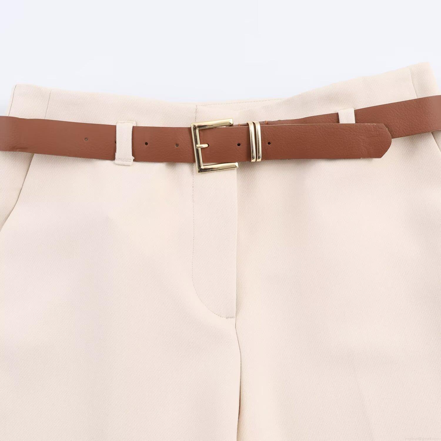 • Women's Casual High Waist Wide Leg Trousers Polyester Spandex Straight Pants with Belt and Cuffed Hem Elegant Solid Color Bottoms