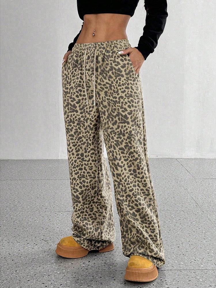 • Women's Casual Leopard Print Wide Leg Pants High Waist Drawstring Checkered Camouflage Straight Trousers Streetwear Autumn Long Pants Polyester Trousers