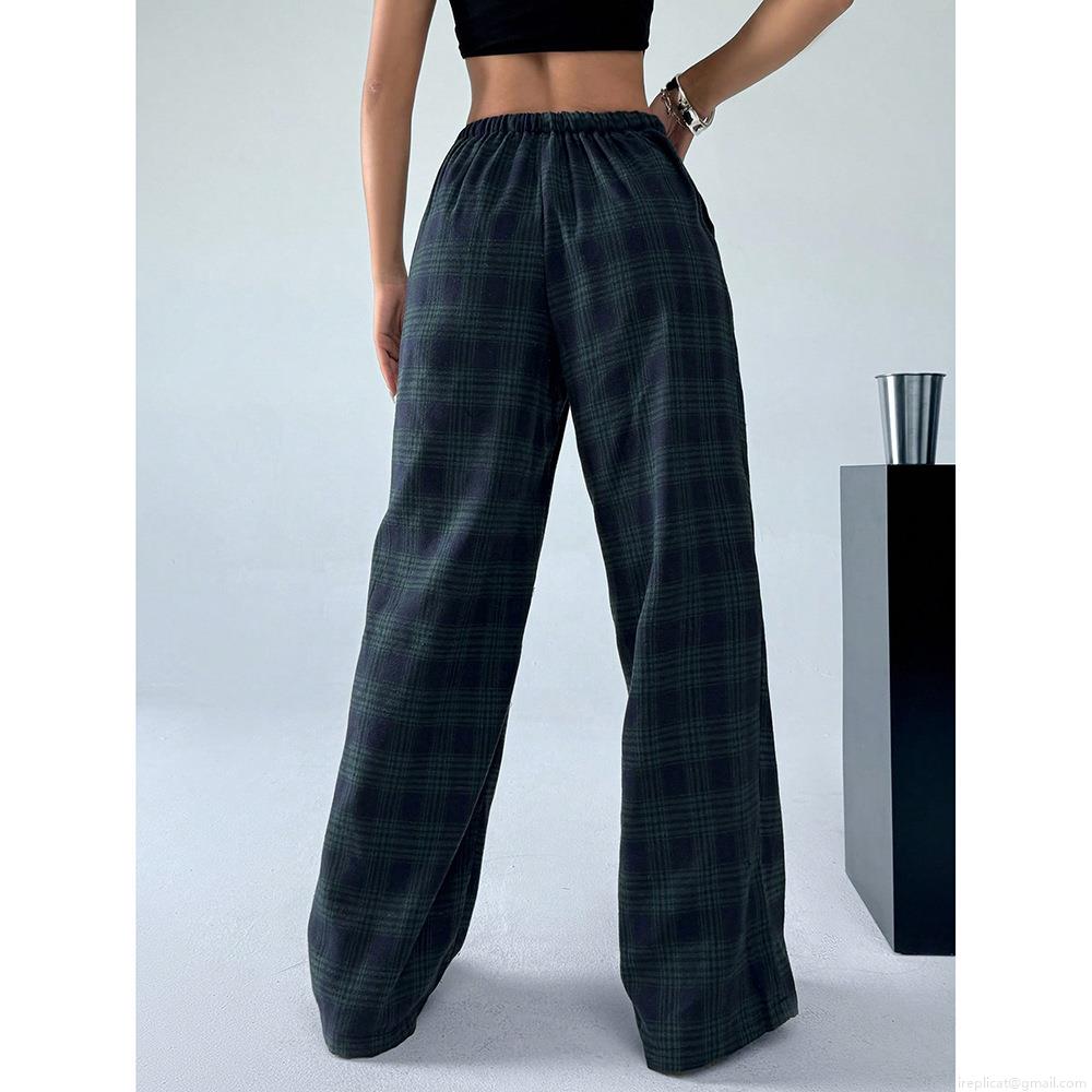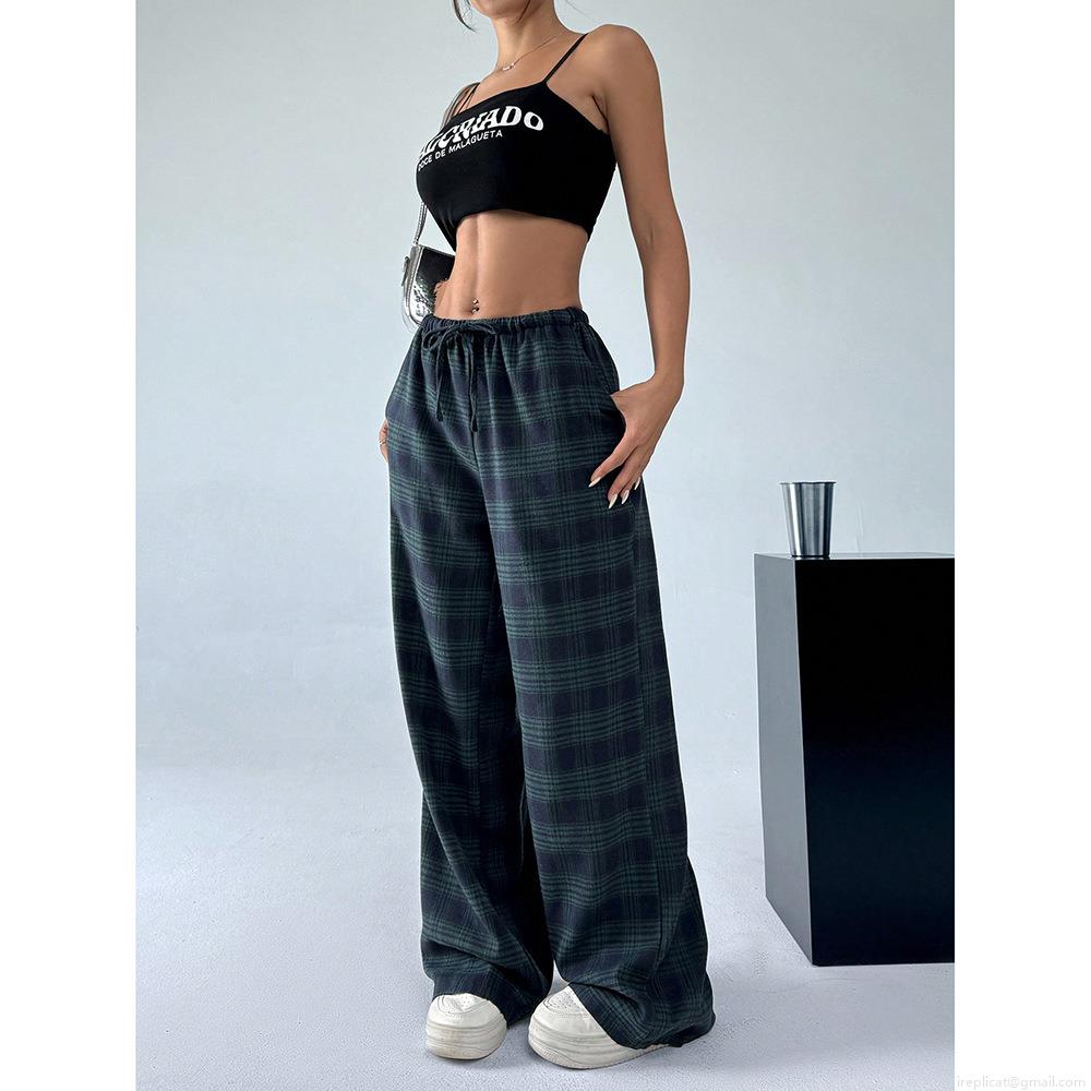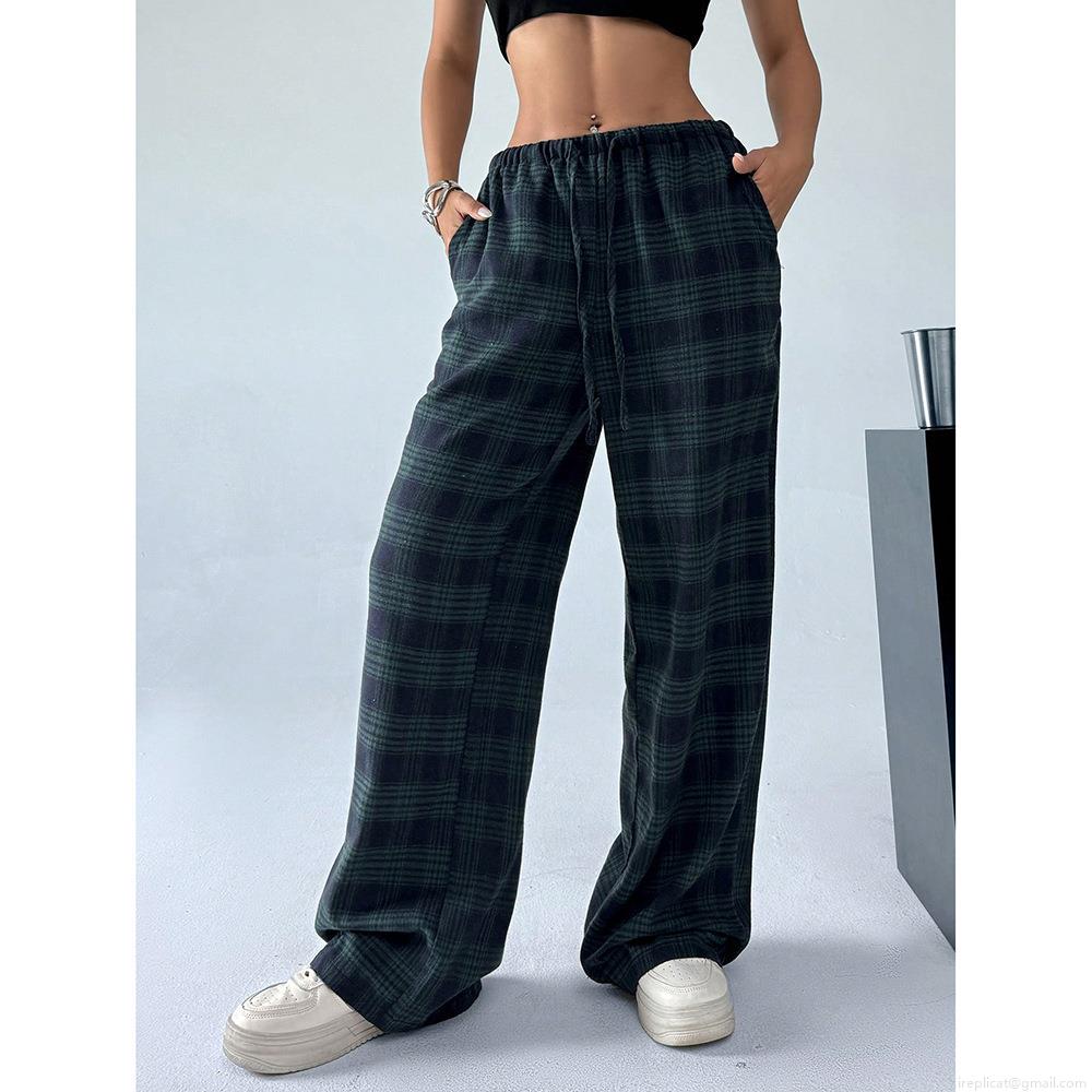 • Women's Casual Plaid Leopard Print Wide Leg Trousers Loose High Waist Drawstring Cargo Pants For Streetwear Autumn Spring Fashion Plaid Trousers