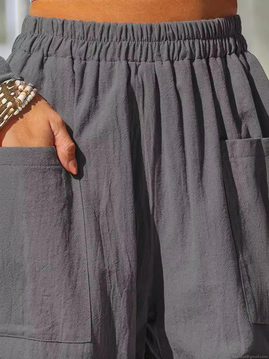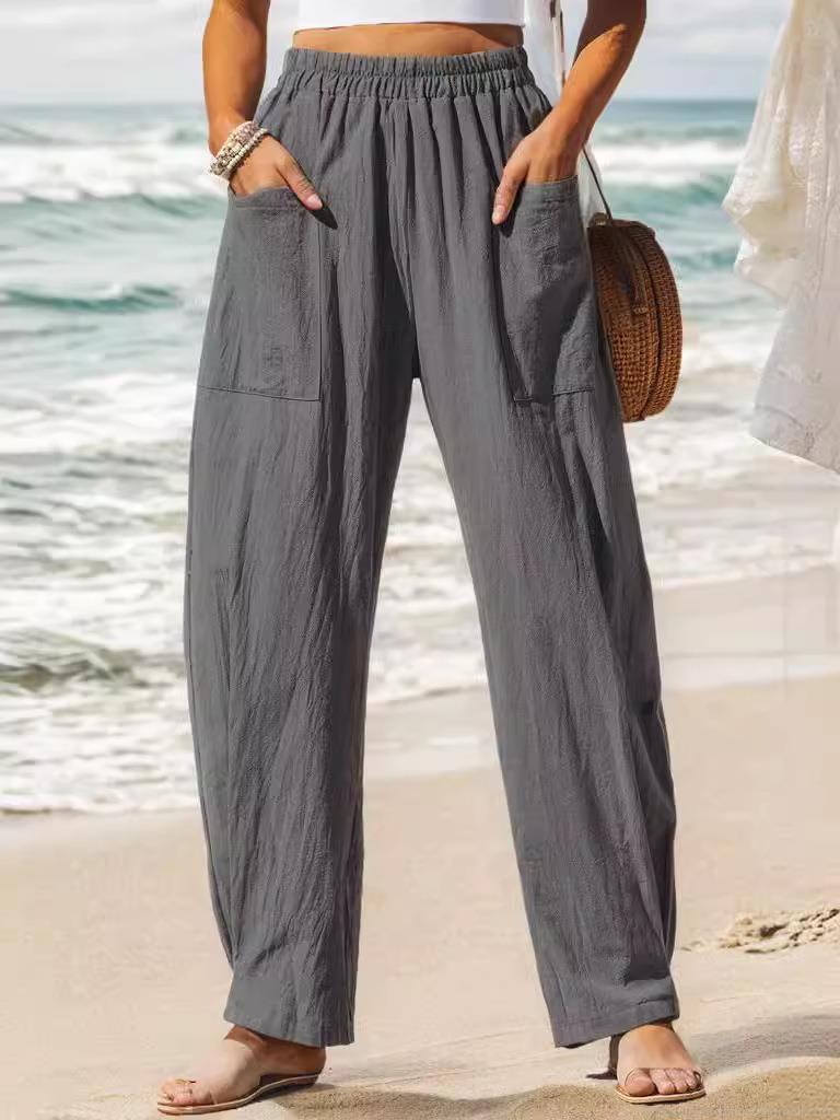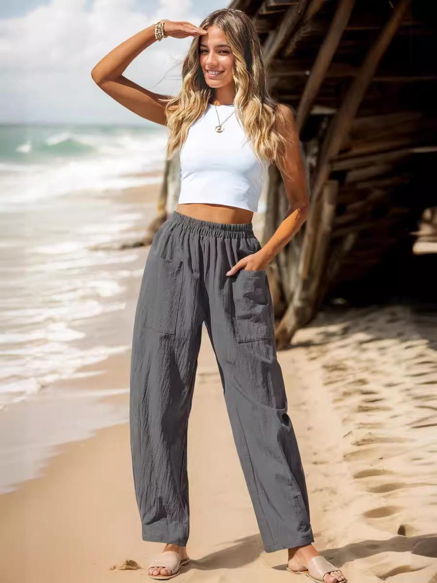 • Women's Cotton Linen Wide Leg Pants High Waist Elastic Waist Casual Trousers With Pockets Loose Fit Beach Vacation Bottoms