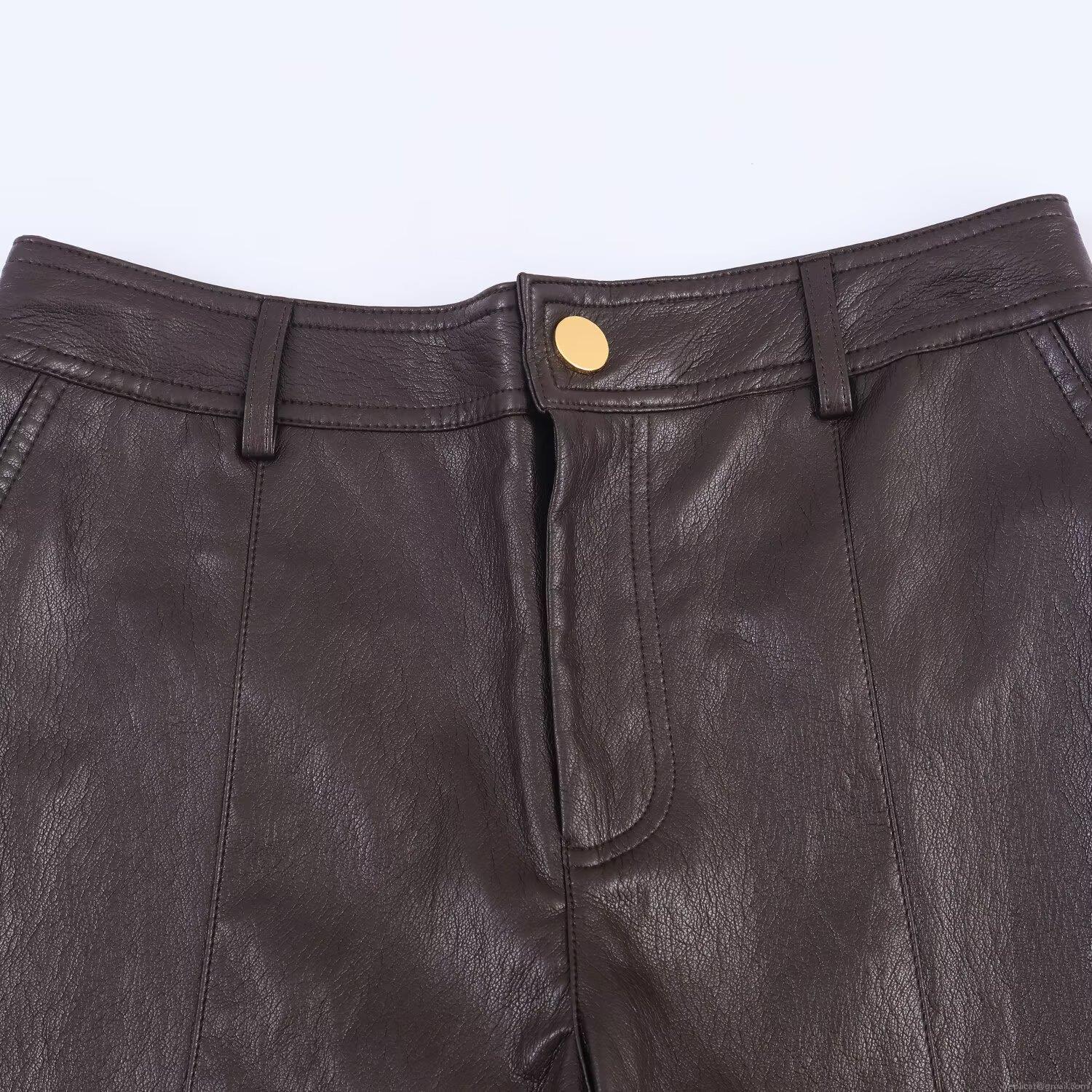 • Women's Fashion Faux Leather Straight Leg Pants High Waist Minimalist Splicing Winter Casual Trousers For Lady Party Streetwear Chic Deep Brown Bottoms