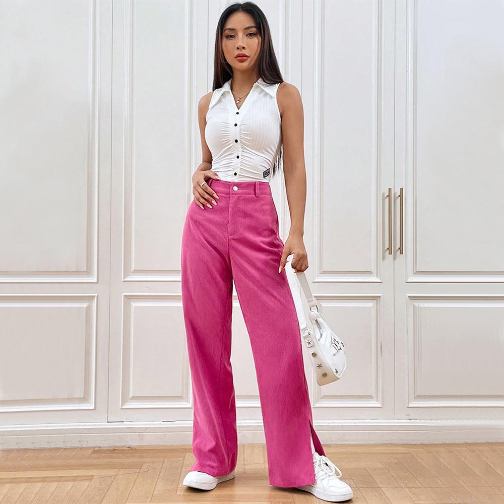 • Women's Fashion High Waist Corduroy Wide Leg Pants Casual Straight Trousers with Side Slit Magenta Rose Pink Solid Color Loose Fit Bottoms for Women