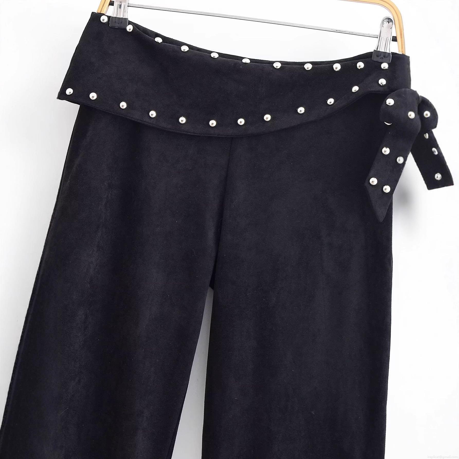 • Women's Flare Pants Sueded Polyester Wide Leg Trousers With Rivet Studded Detail Side Bow Lace Up Casual Streetwear Black Autumn Winter Bottoms