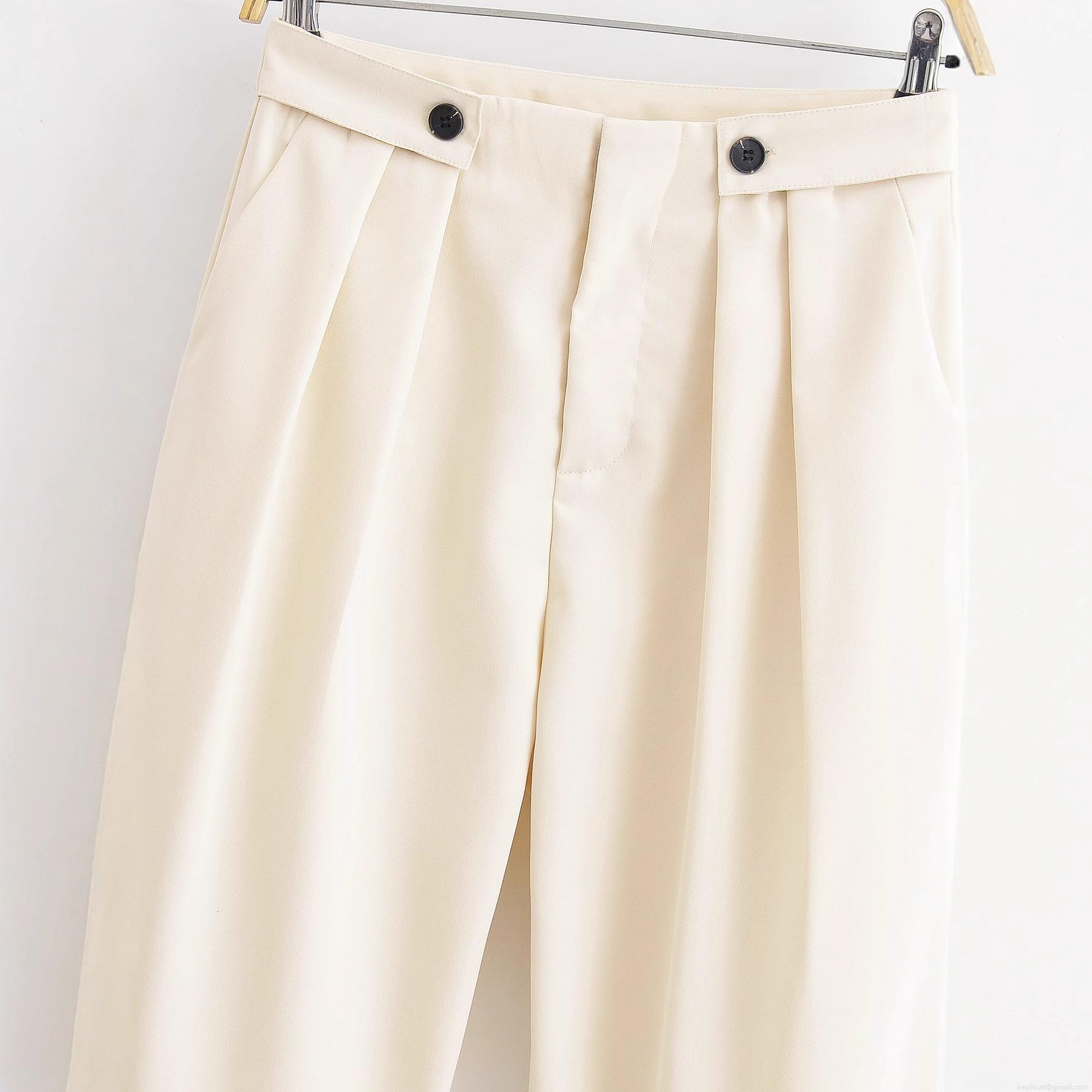 • Women's High Waist Casual Trousers 100% Polyester Woven Fabric Straight Leg Pants With Double Button Pleated Detail For Daily Office Wear Elegant Cream White Long Pants