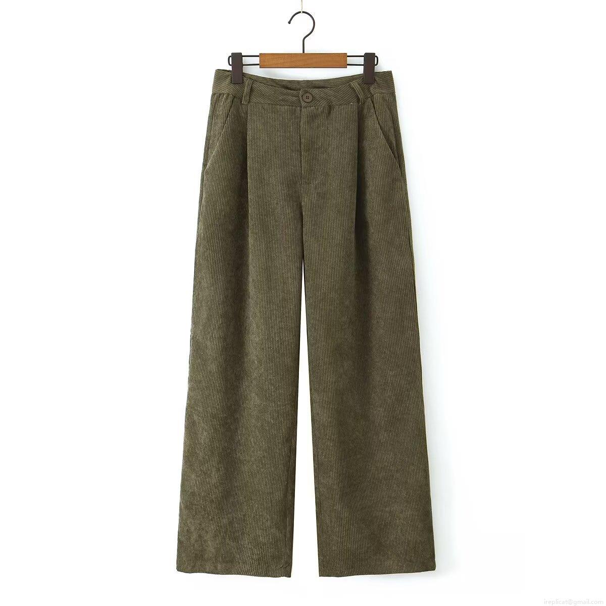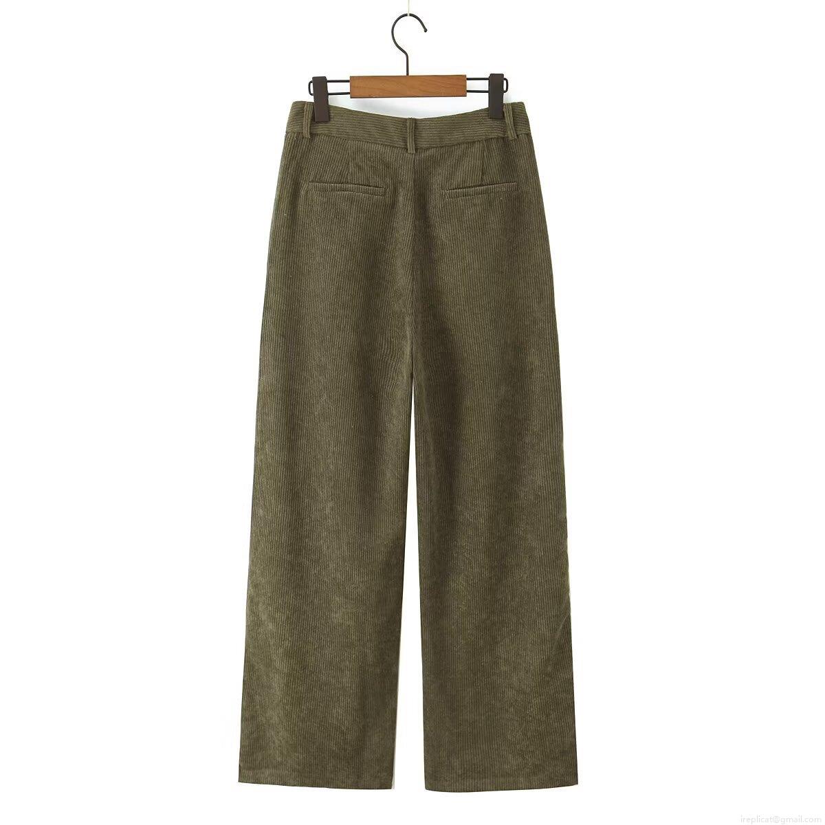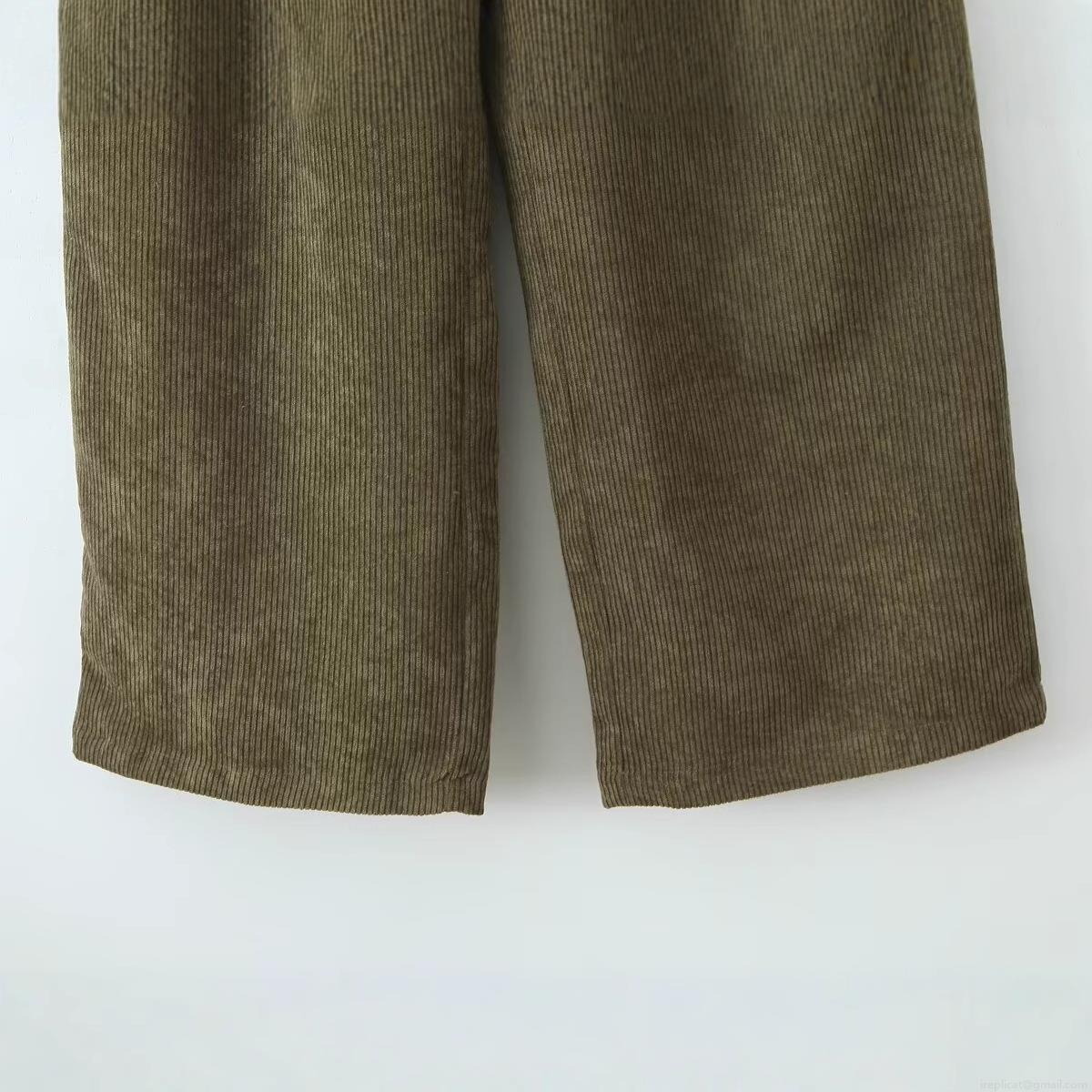 Women's High Waist Corduroy Wide Leg Pants Vintage Solid Olive Green Casual Straight Long Trousers With Pockets Elegant Loose Fitting Bottoms For Ladies
