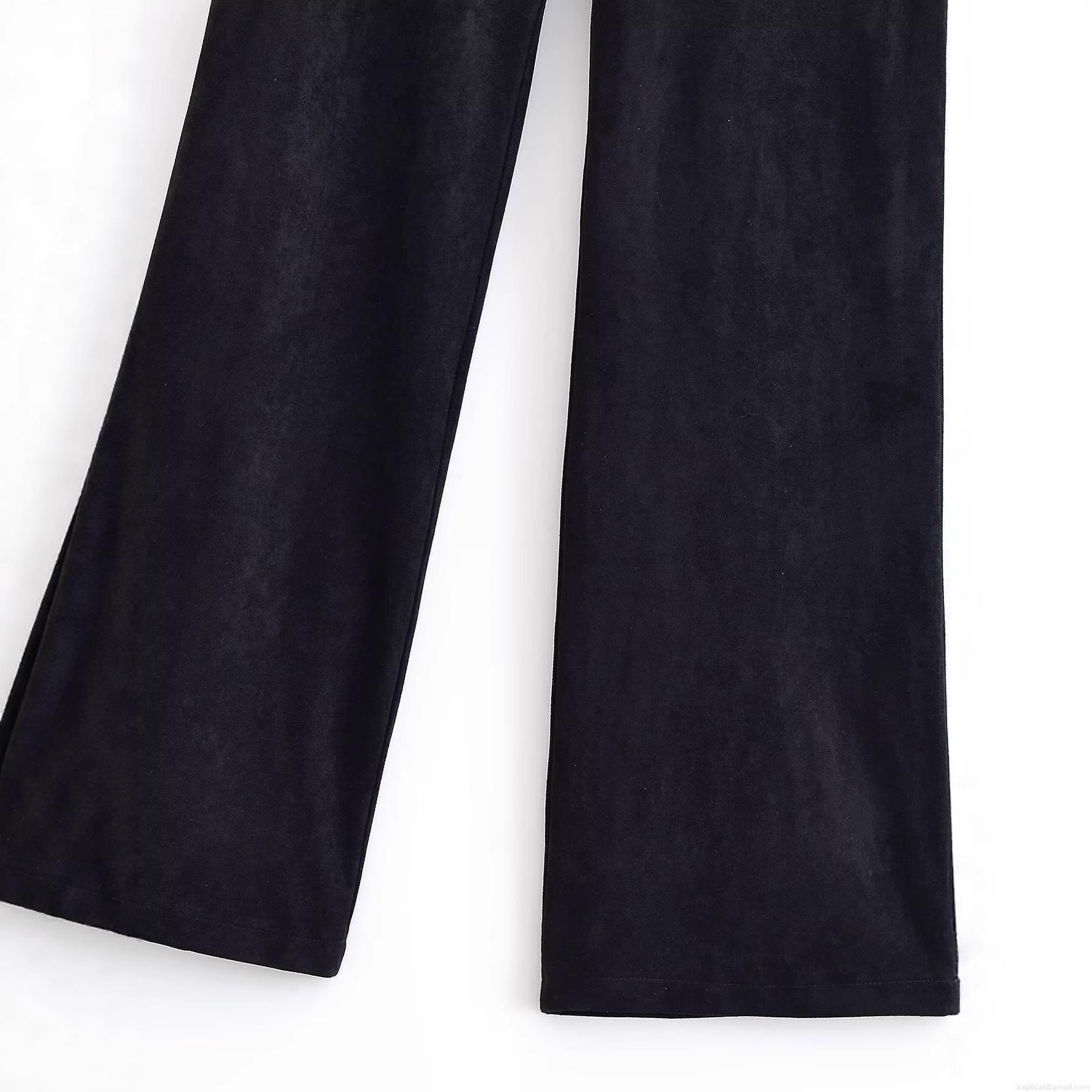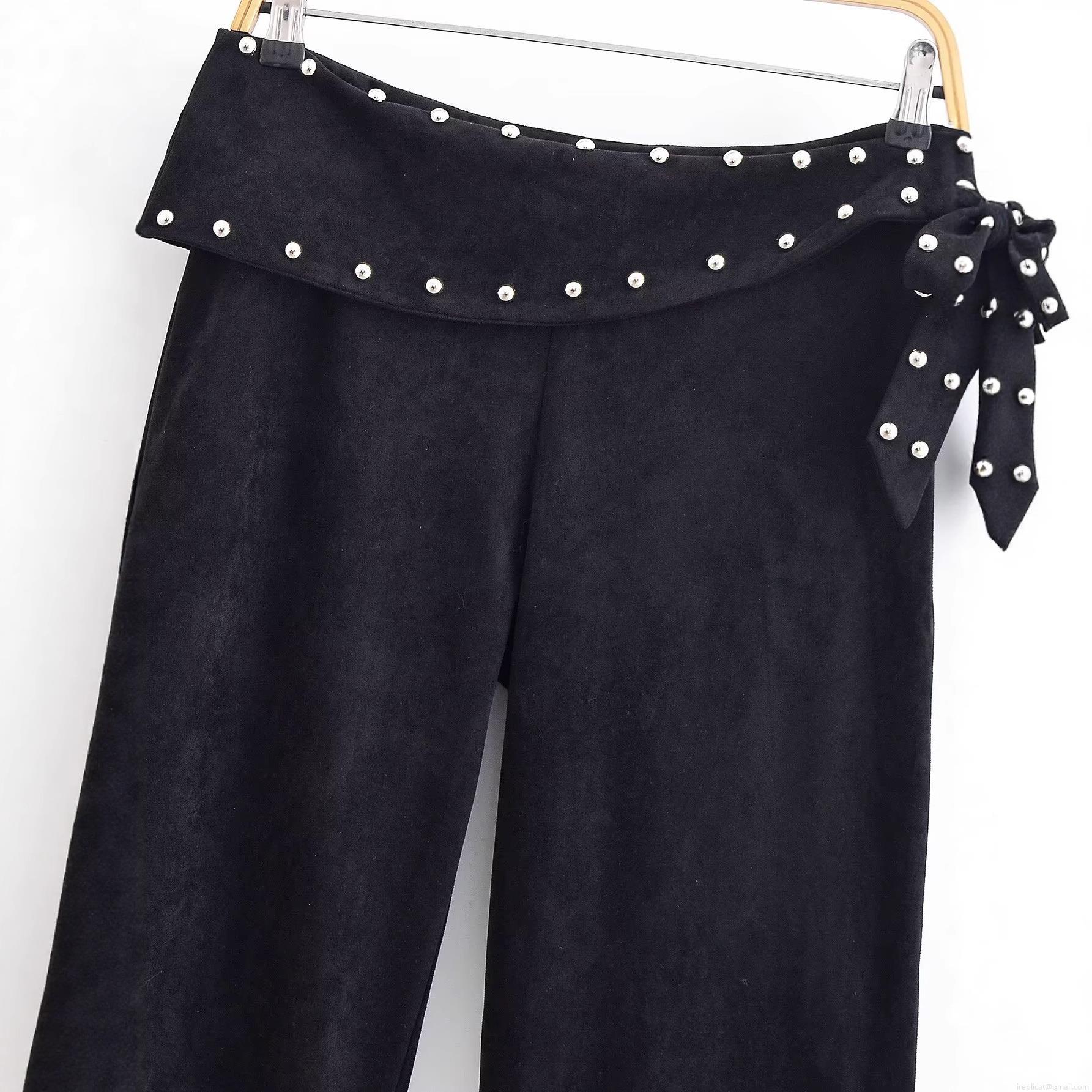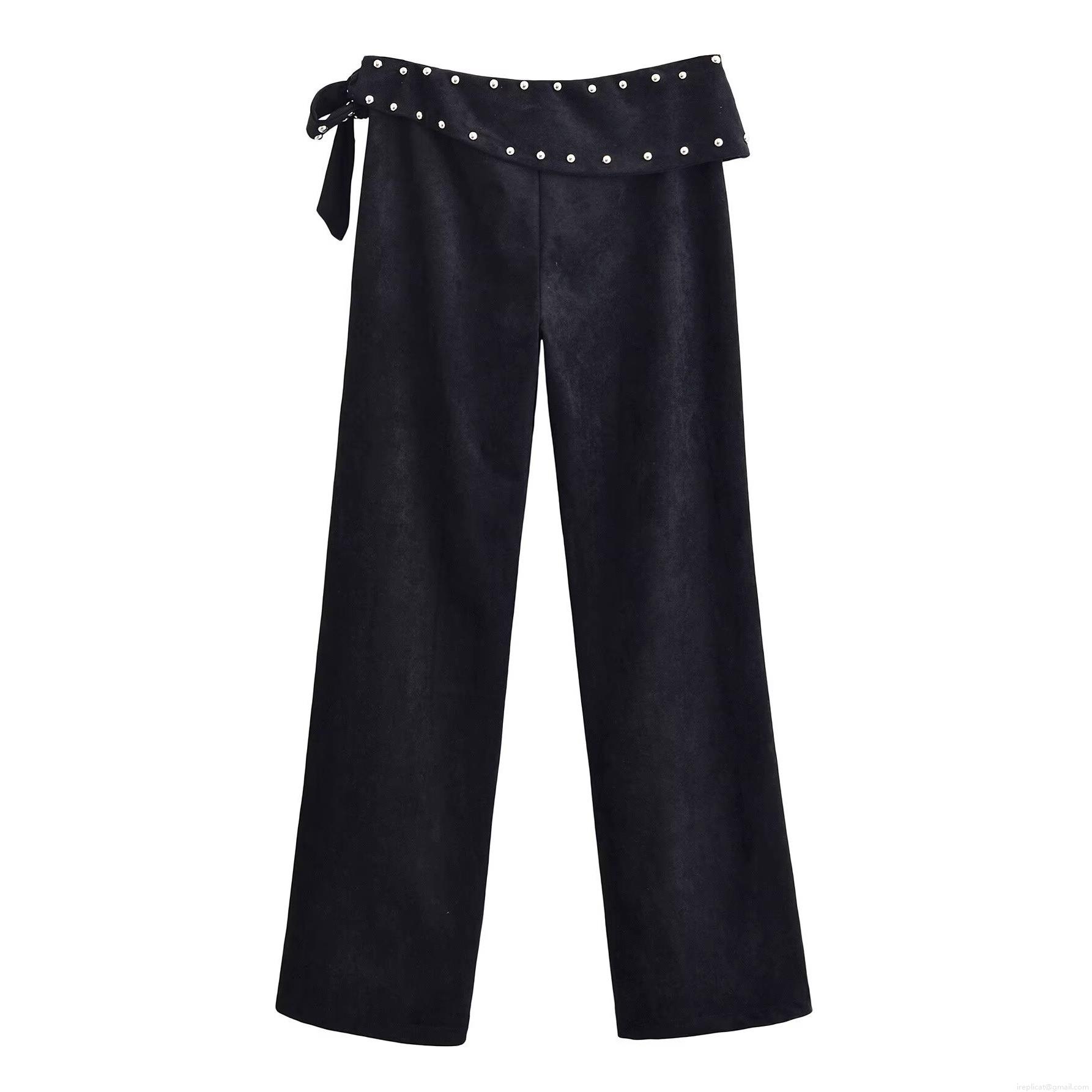 • Women's High Waist Flare Pants Suede Fabric Rivet Decor Side Tie Casual Solid Color Long Trousers Chic Style Autumn Winter Bottoms