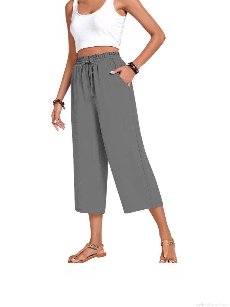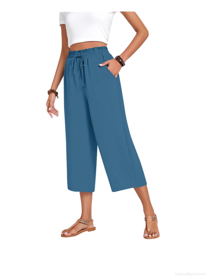 • Women's High Waist Linen Wide Leg Pants Solid Color Elastic Waist Drawstring Casual Cropped Trousers With Pockets For Summer Daily Wear