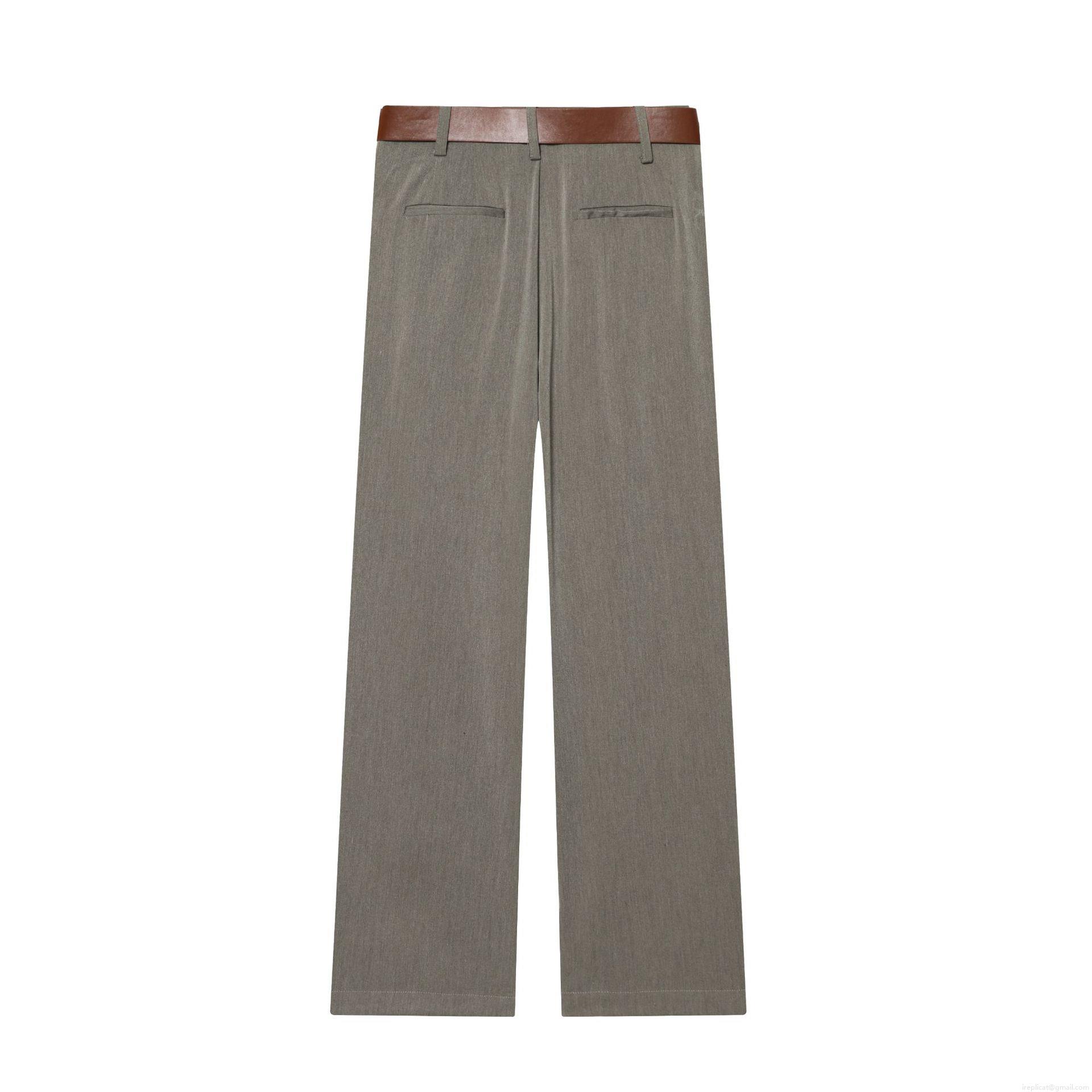 Women's High Waist Straight Leg Pants With Brown Leather Belt Polyester Blend Core-spun Yarn Twill Long Trousers Office Casual Versatile Elegant Bottoms For Ladies