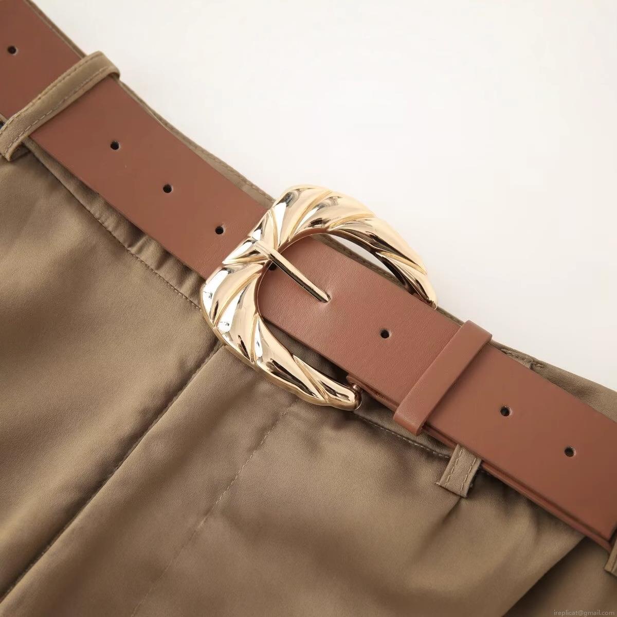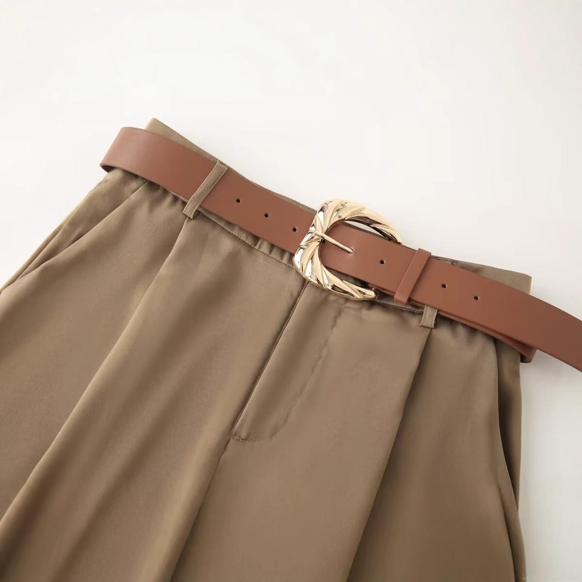 • Women's High Waist Wide Leg Casual Pants With Belt Solid Color Polyester Satin Texture Elegant Office Straight Trousers For Women Classy Daily Wear