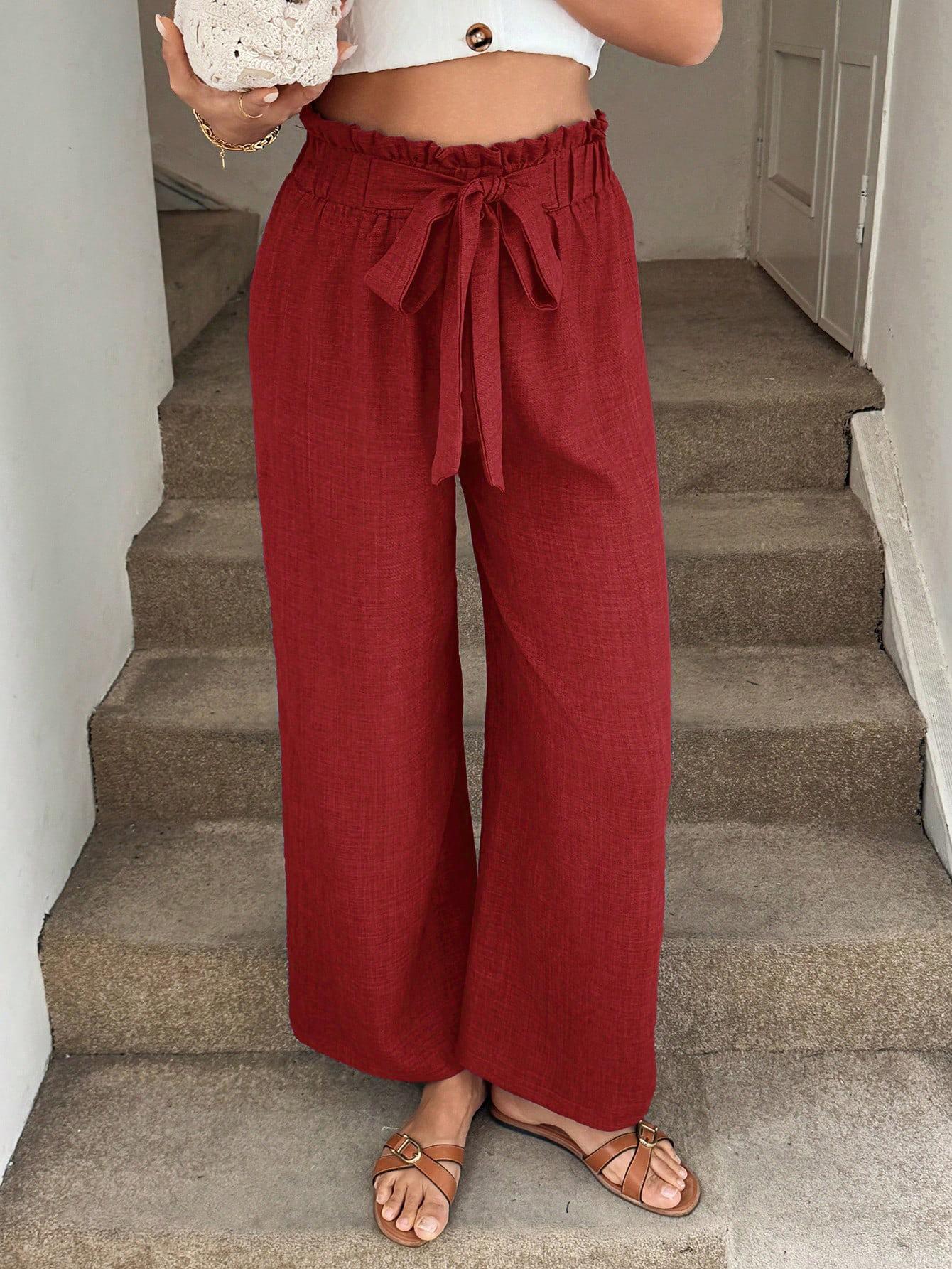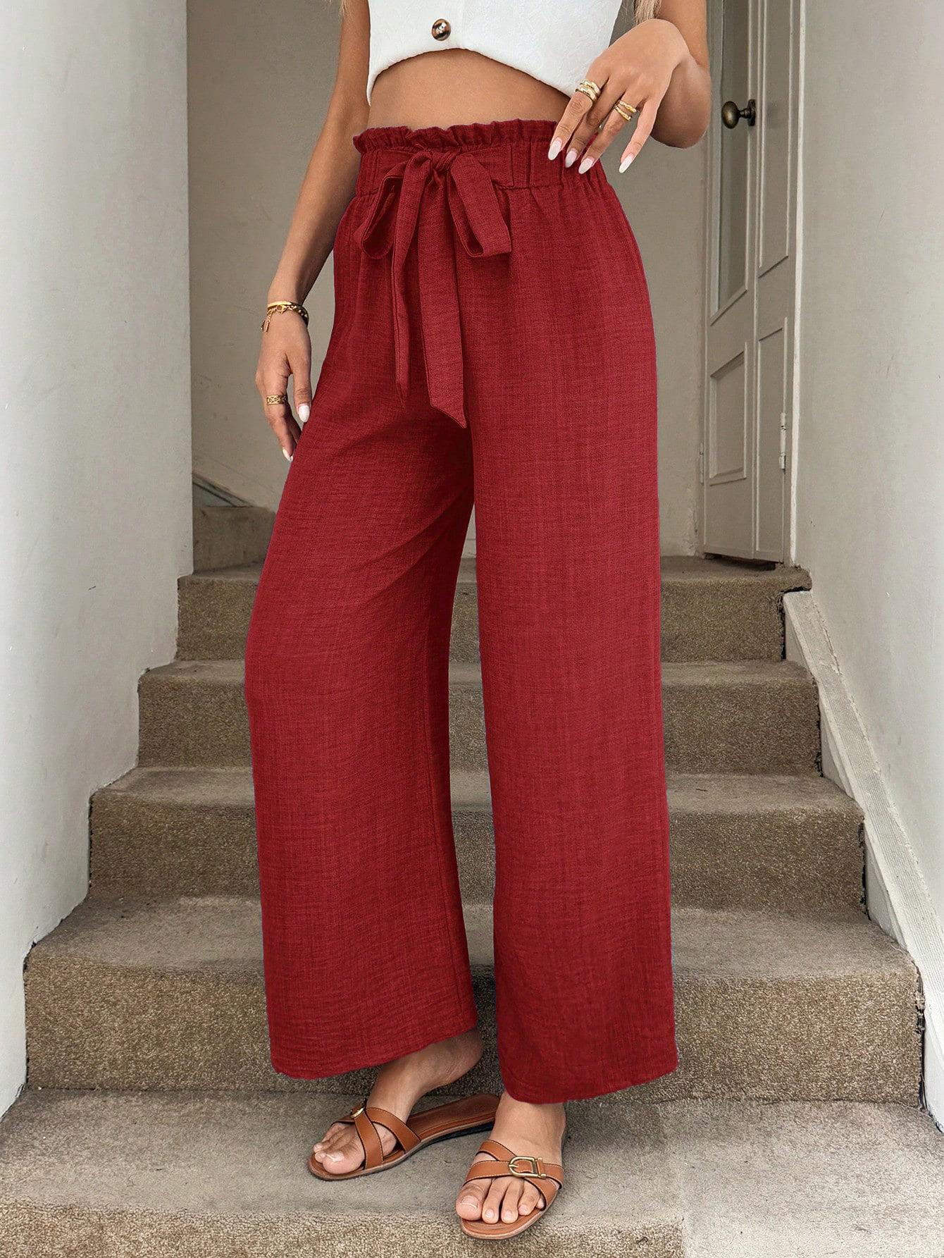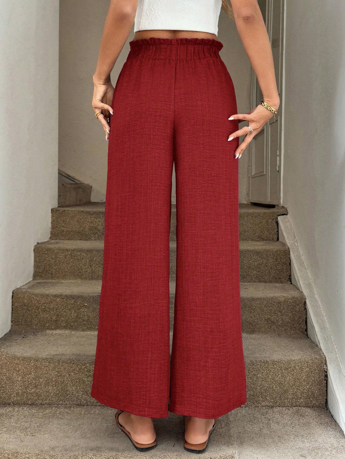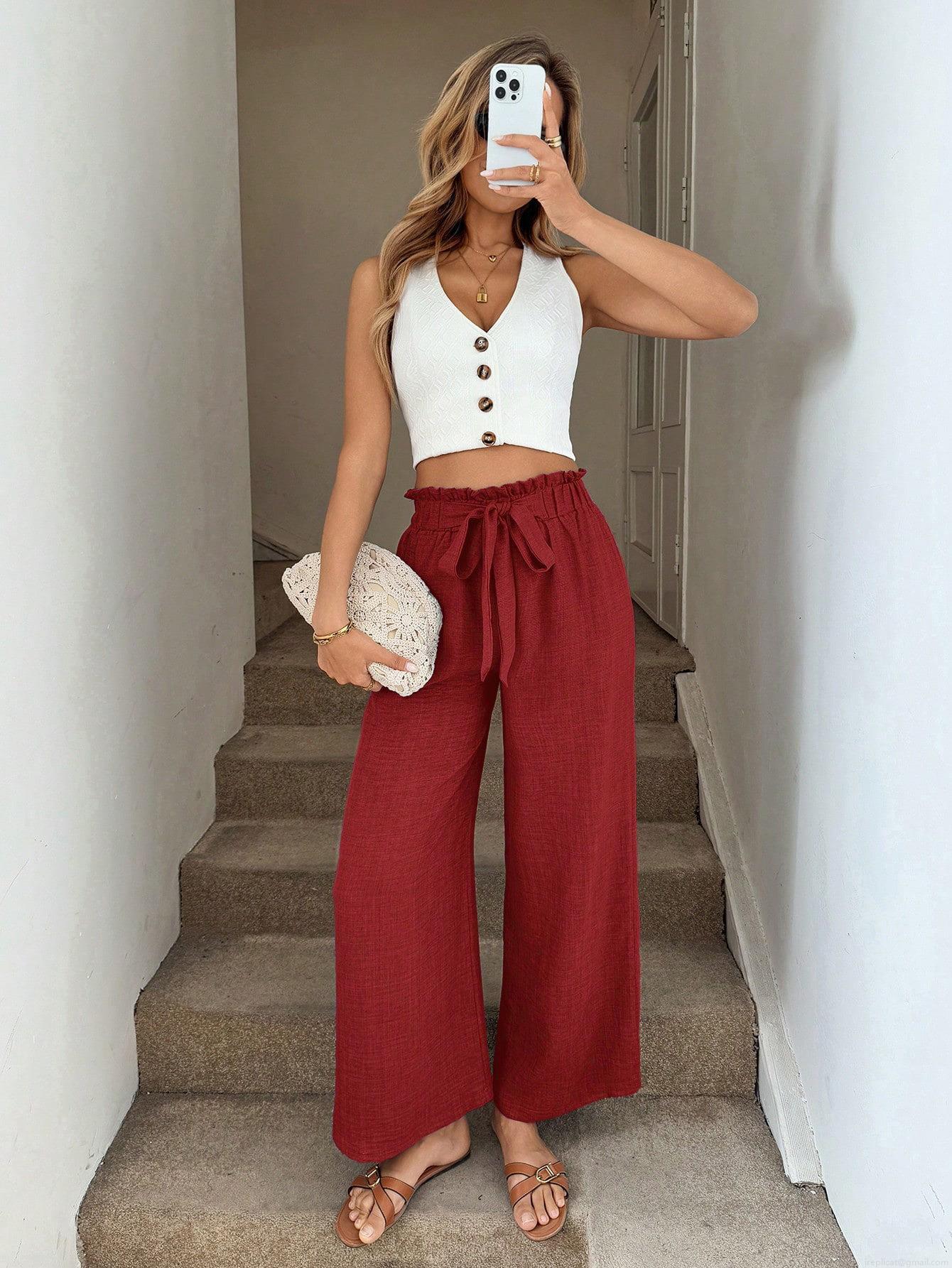• Women's High Waist Wide Leg Pants Polyester Blend Linen Texture Tie Front Elastic Waist Casual Loose Drape Trousers for Vacation Beach Summer Daily