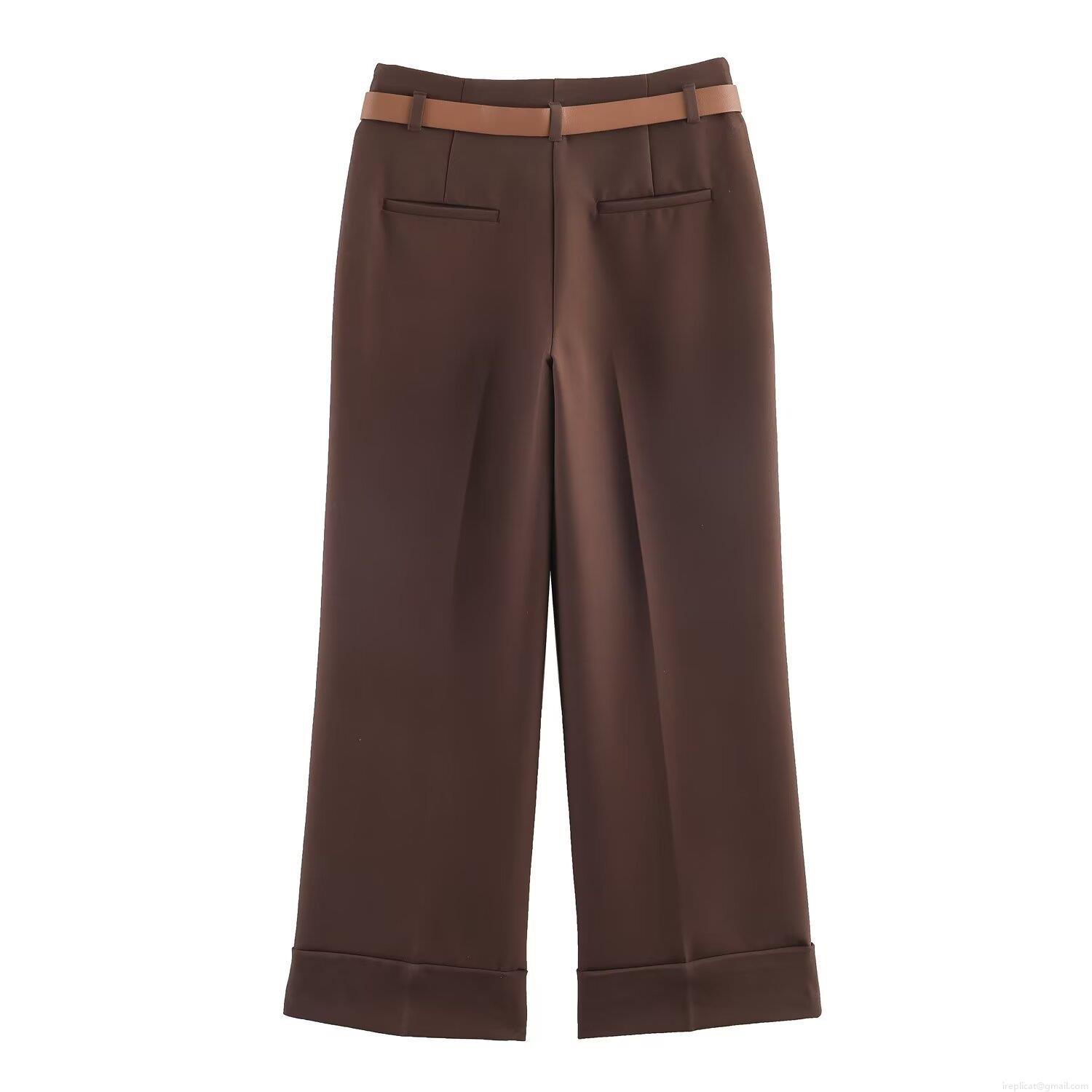 • Women's High Waist Wide Leg Pants With Belt Fashion Cuffed Hem Straight Trousers Casual Office Commute Solid Color Polyester Pants For Women