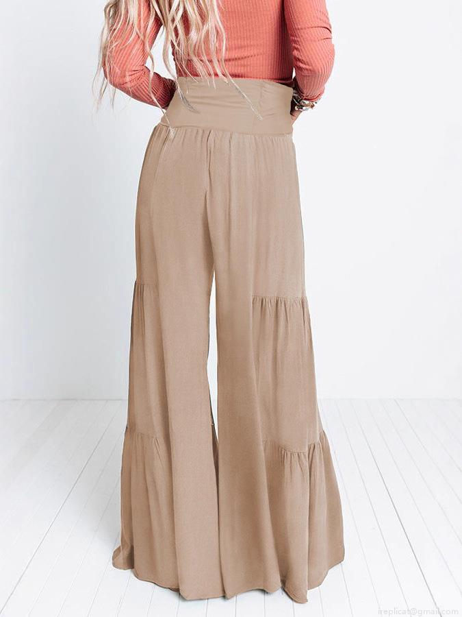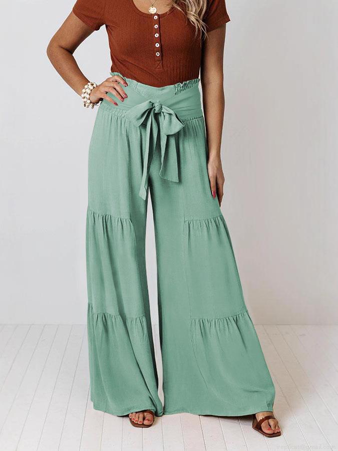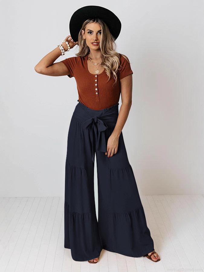 • Women's High Waisted Wide Leg Pants Cotton Blend Tiered Layered Smocked Trousers With Bow Tie Waist For Summer Beach Vacation Casual Commute Fashion Loose Palazzo Pants