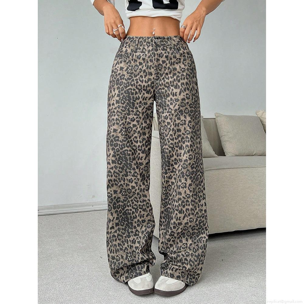 • Women's Leopard Print Wide Leg Pants High Waisted Loose Straight Trousers Casual Vintage Washed Streetwear Fashion Full Length Trousers For Women