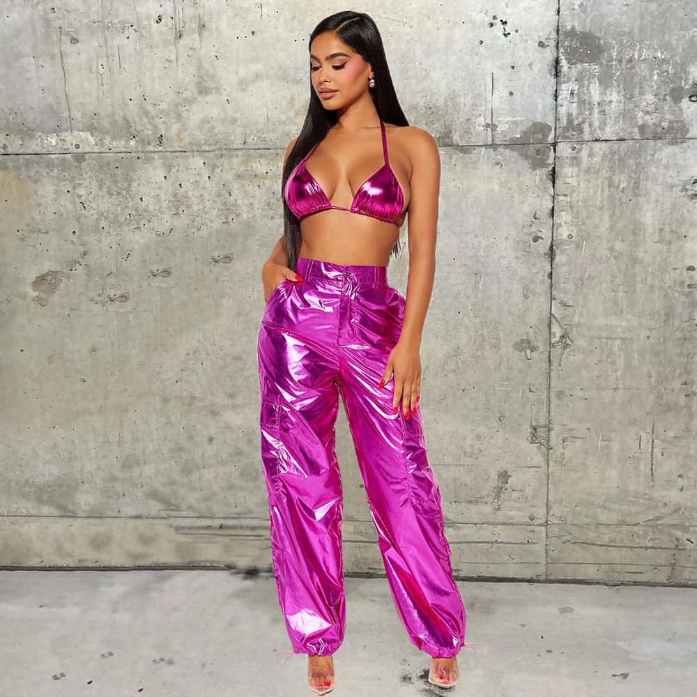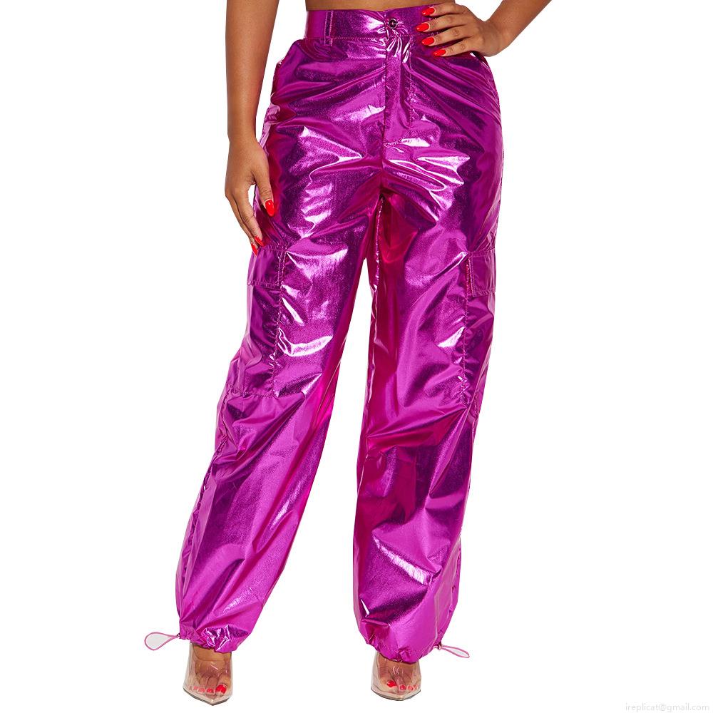 • Women's Metallic Shiny Cargo Pants High Waist Loose Streetwear Joggers With Pockets Fashion Y2K Party Trousers Stretch Metallic Leather Pants